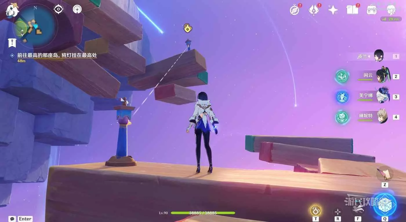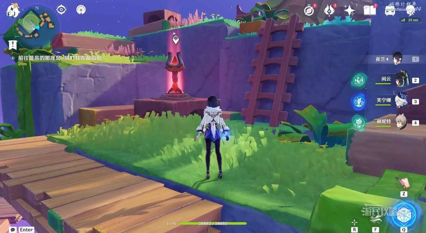 爬上梯子後往左看,可以看到浮空的三個跳台,在第一個跳台(距離我們最近的)上原地跳兩下直到看到第二個跳台上出現神諭柱,然後在跳到第二個跳台上。