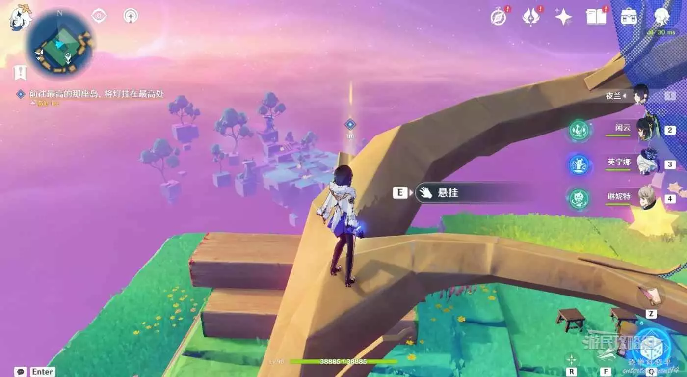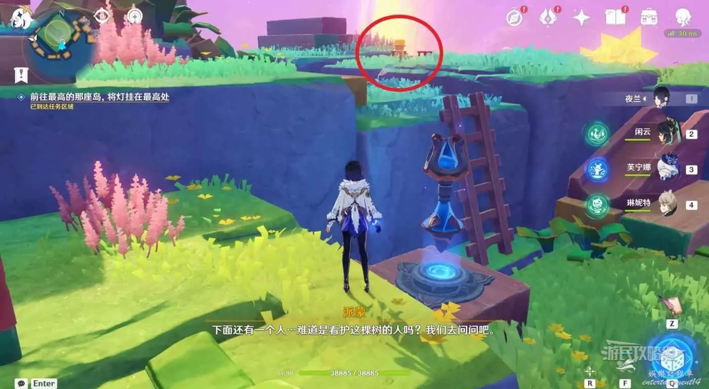 對話完畢後,跟隨任務指引爬上旁邊的樹,把燈掛在樹上,觸發對話。