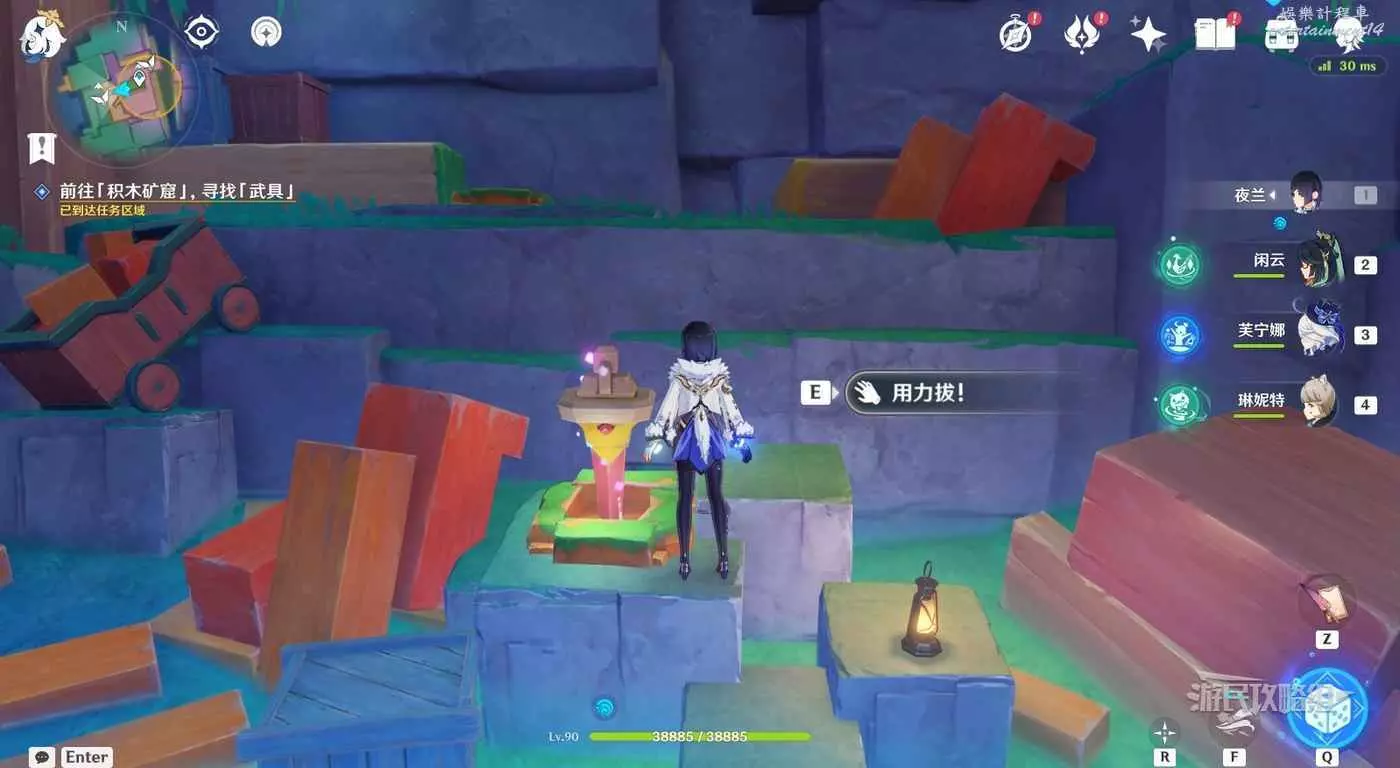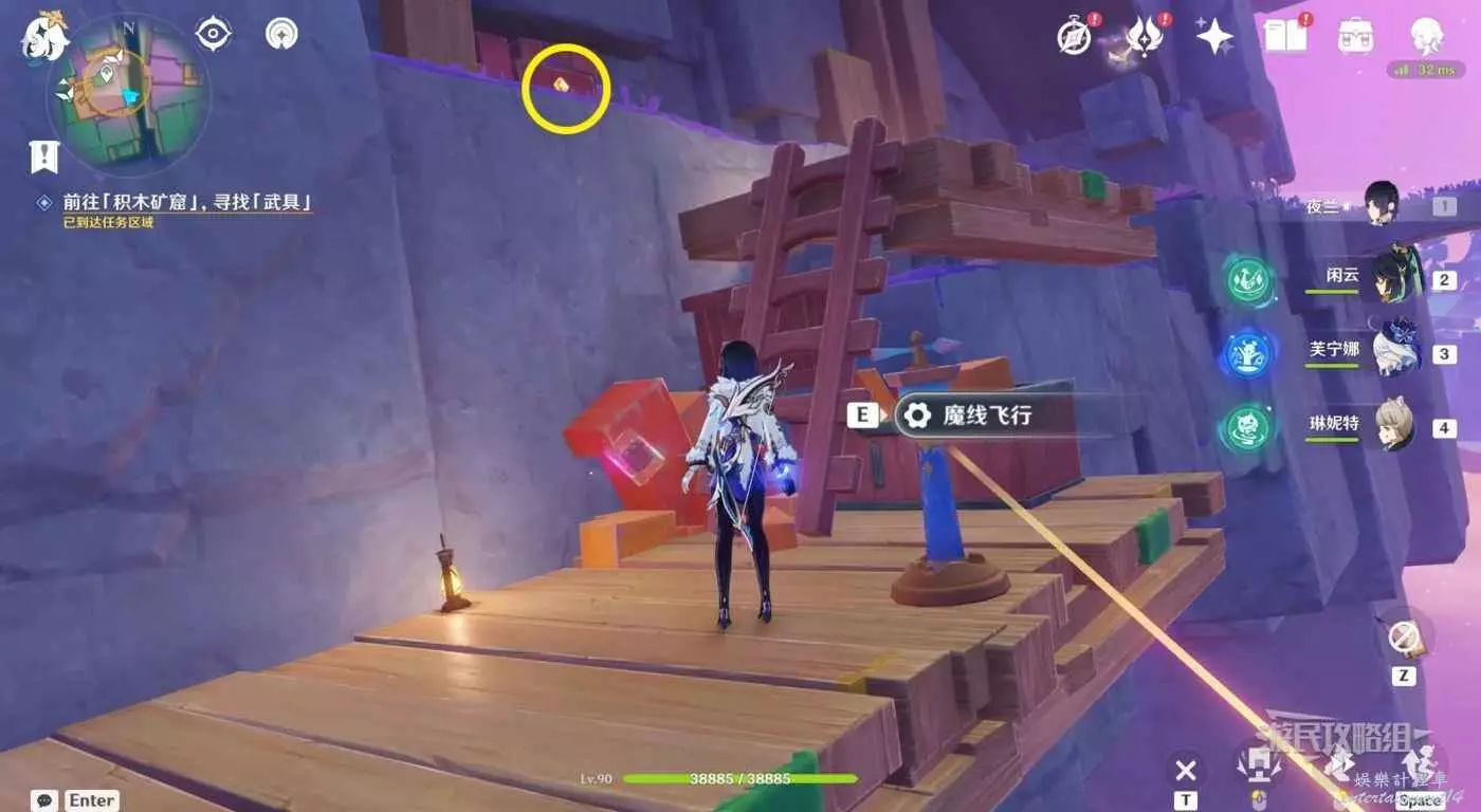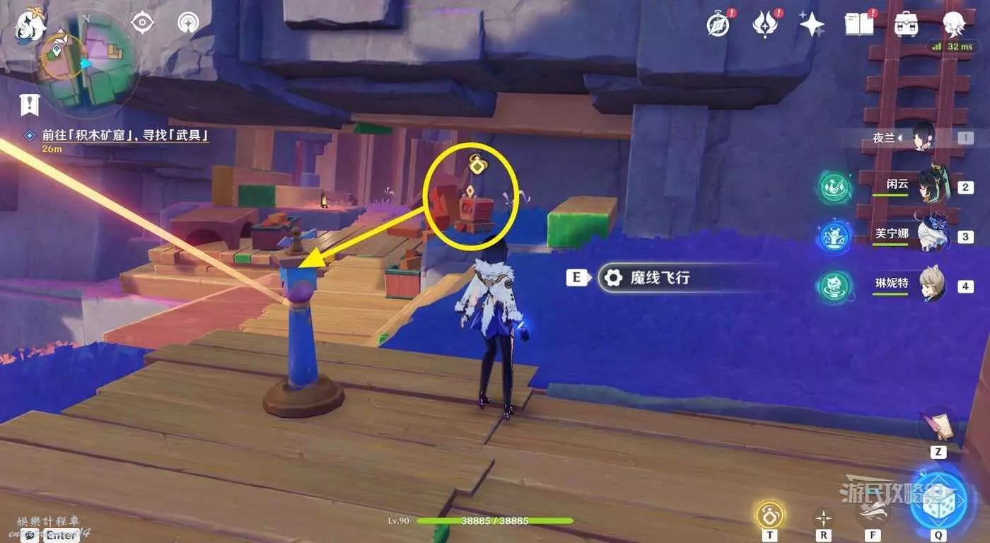 梯子旁邊可以看到一個神諭柱和積木炸彈,按T拾取積木炸彈然後與神諭柱互動魔線飛行。