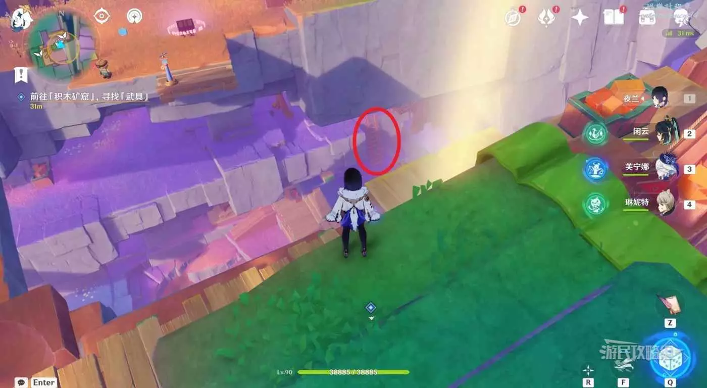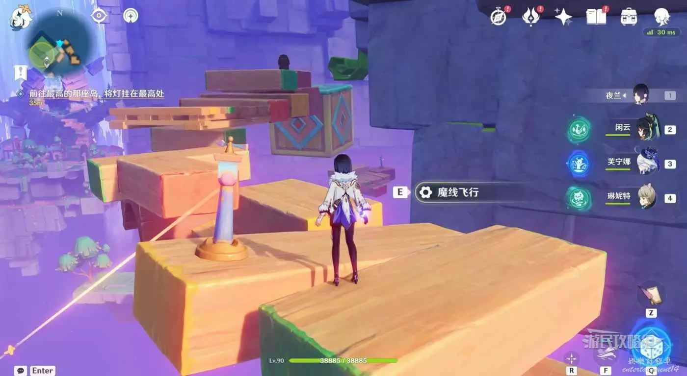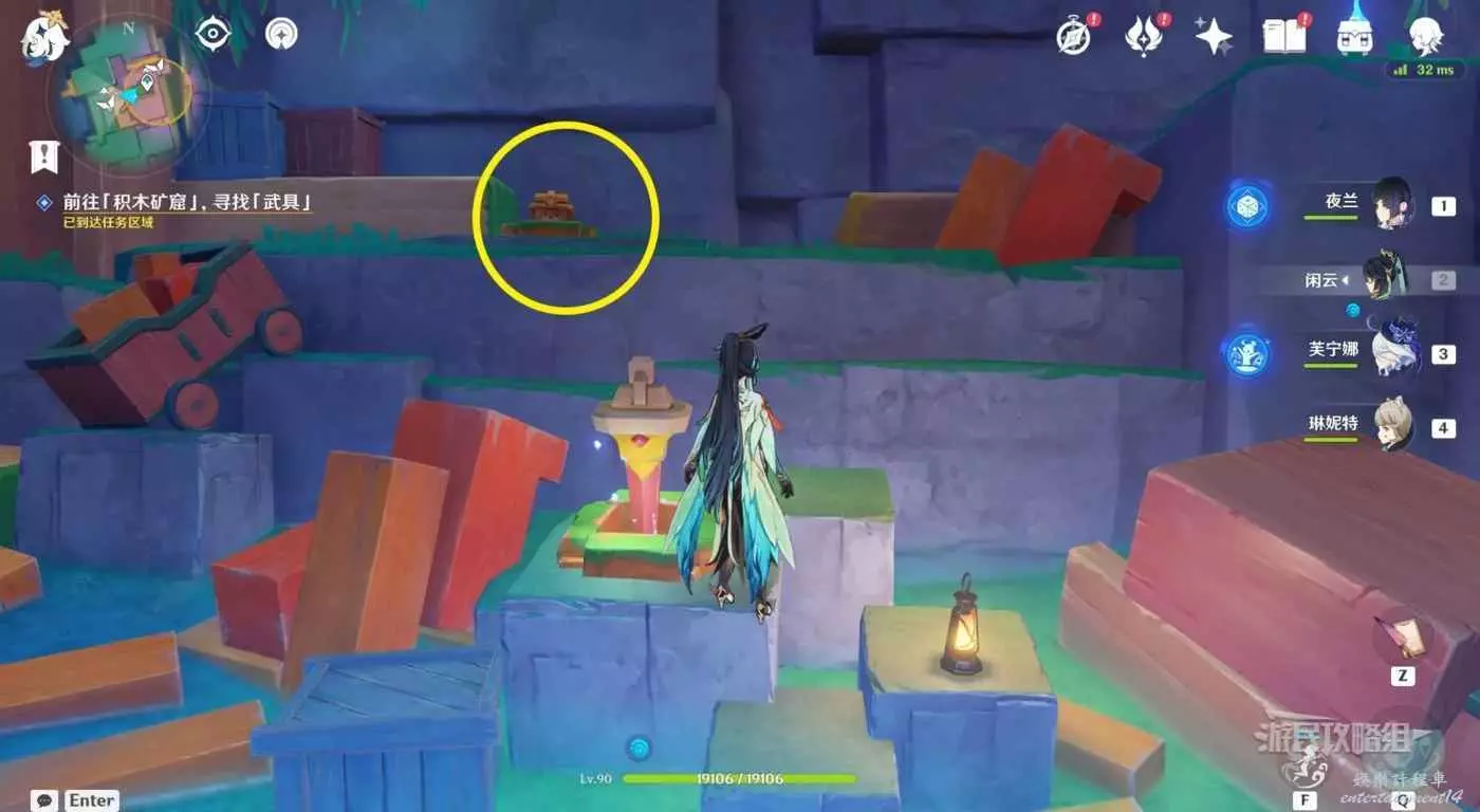 梯子旁邊可以看到一個神諭柱和積木炸彈,按T拾取積木炸彈然後與神諭柱互動魔線飛行。