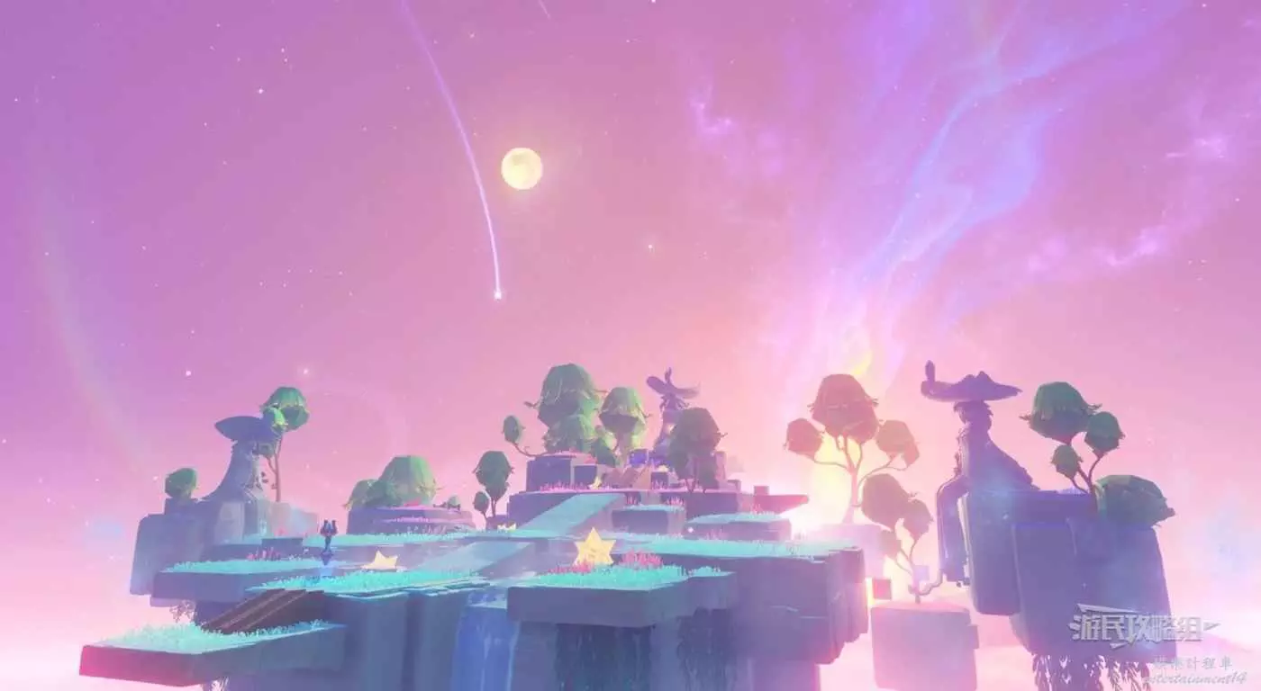分別與島上三座雕像手心處的光點互動,觸發對話。