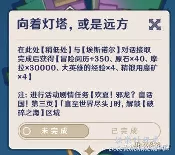 到達地點後,和NPC對話要把歪倒的燈塔扶正(我的任務已經完成了,NPC不在這裡),根據任務提示在周圍幾個光柱處探索之後,最後在燈塔側面的入口進入,往燈塔頂看可以拾取頂上的燈球,然後回去和NPC對話根據任務提示會來到我們一開始無法拿寶箱的小島上。