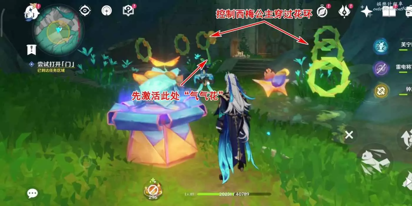 控制西梅公主啟動大門旁的“氣氣花”,啟動後完成穿越花環挑戰即可。