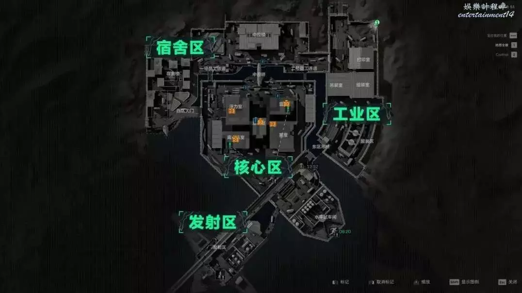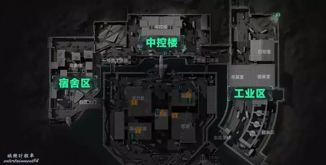 北部的中控樓,共有約29個固定物資點,在週邊資源區中物資量最多。位於二樓的保險櫃值得優先搜索,更重要的是這裡擁有極佳的視野,進入核心區以前可以從這個位置捕獲大量資訊。