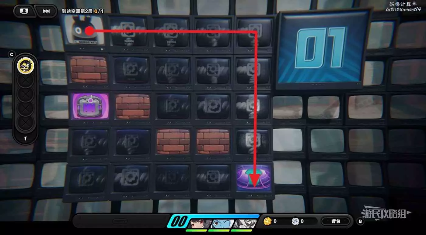 從傳送門到達第二層後,往上走拾取樣本,然後返回初始位置,往右走進入傳送門。