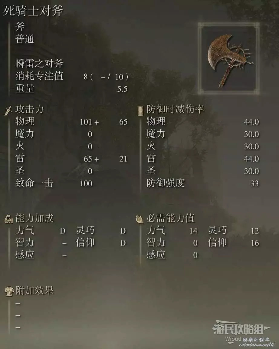 武器類型為斧,主吃力氣與靈巧和信仰補正,也就是說死亡騎士對斧比較適合信仰戰士使用。
