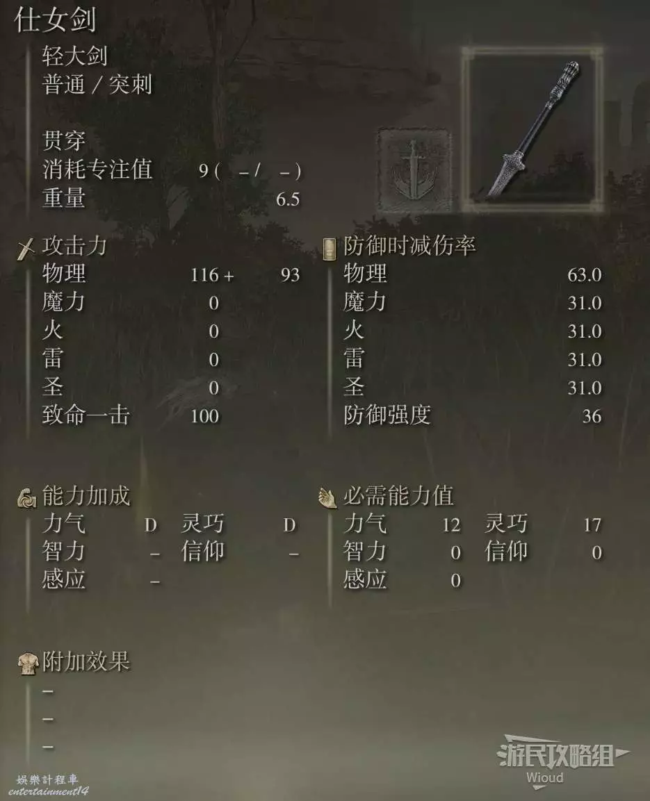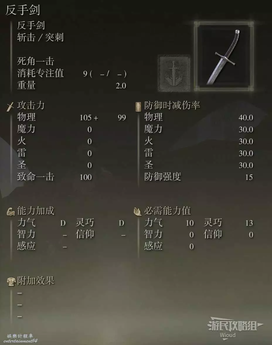 攻擊屬性為斬擊與突刺,重量是2,基礎削韌為5,物理畢業面板為625。