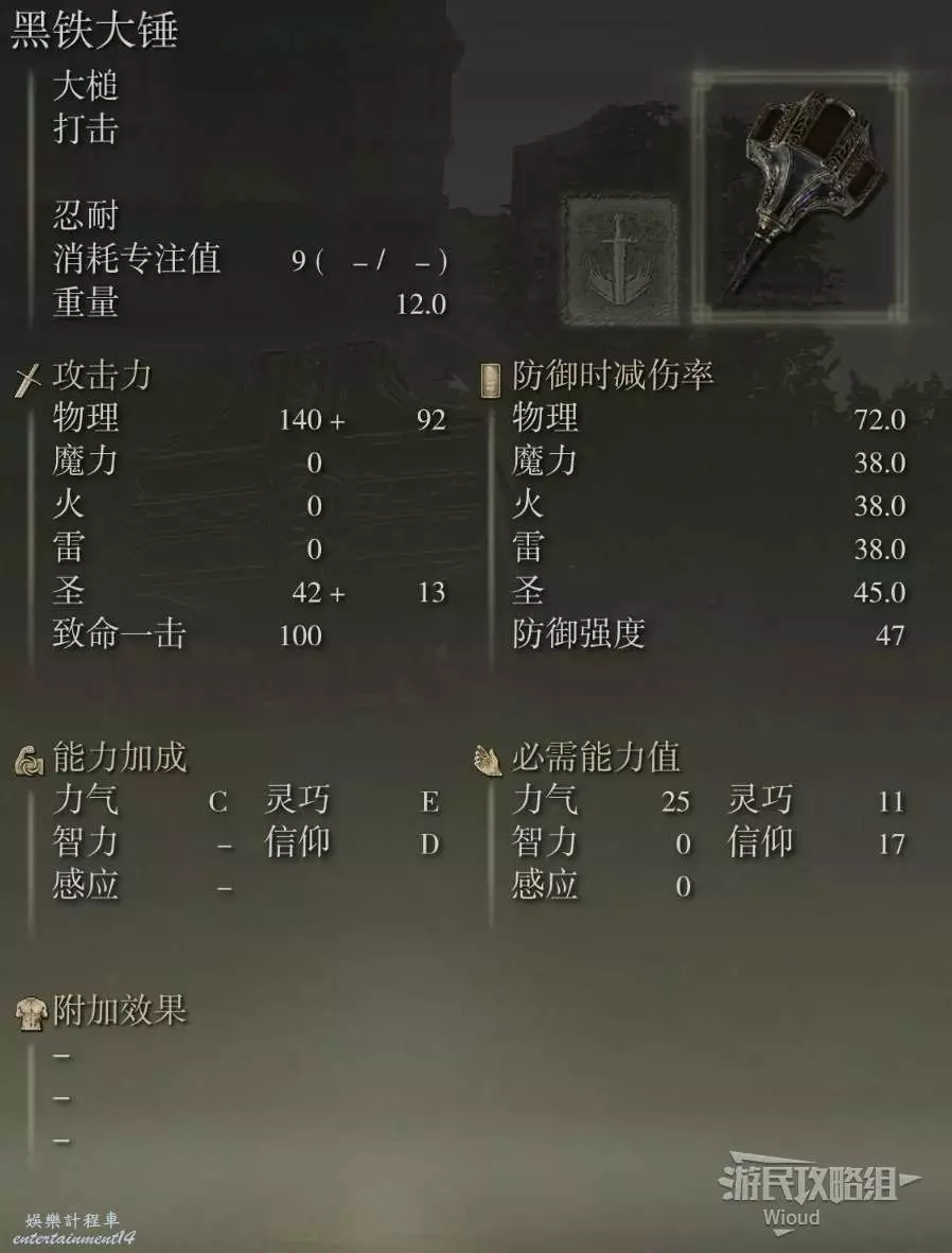 護符正常攜帶重裝戰士的護符或力信戰士的護符即可,黑鐵大錘目前能背負大槌的DEBUFF打出特大錘的效果,喜歡重裝的小夥伴一定要試一試這把武器。