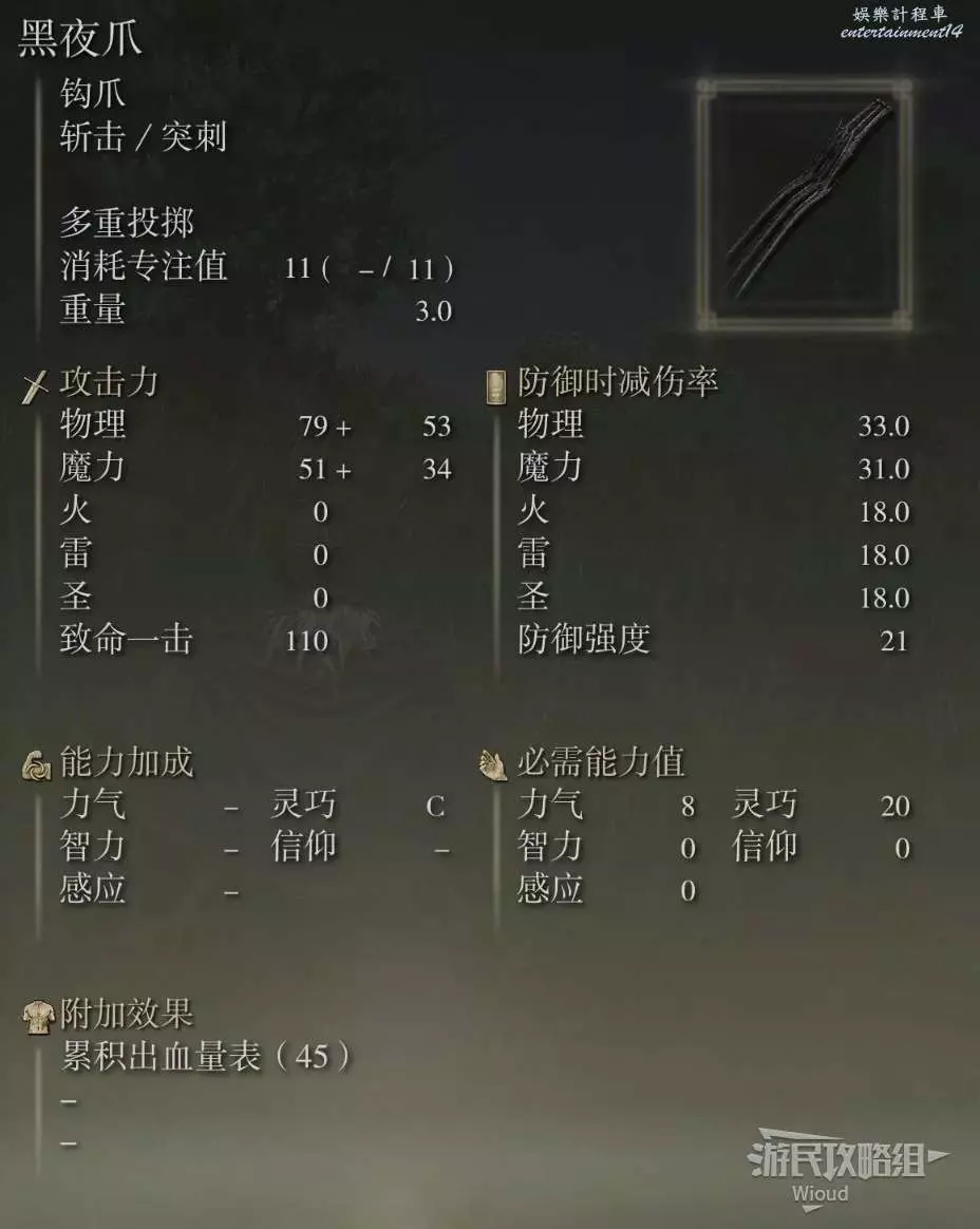武器類型為鉤爪,主吃靈巧補正,攻擊屬性為斬擊與突刺,重量是3,基礎削韌為4,,物理畢業面板為429,魔力畢業面板為276,累積出血量表為45。