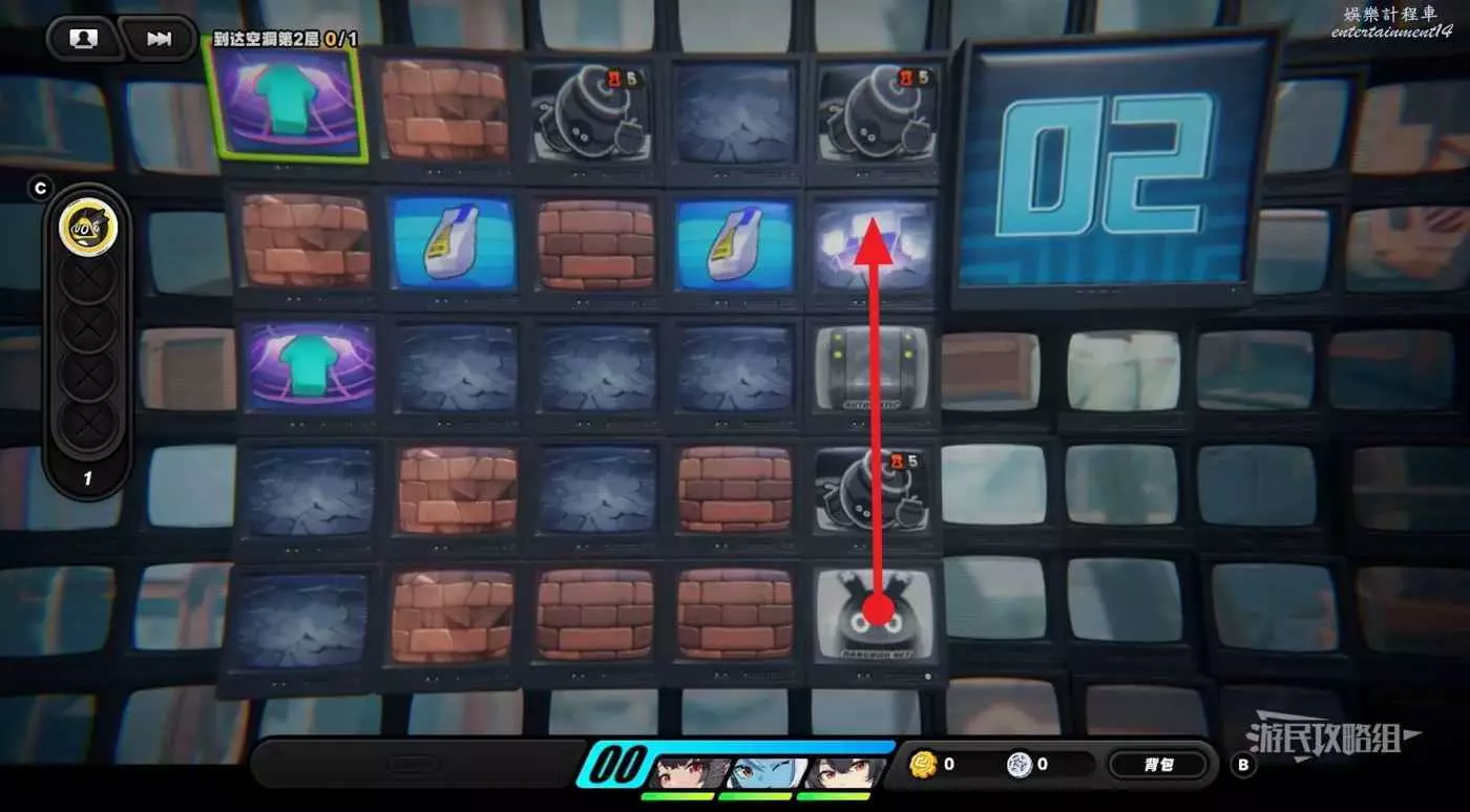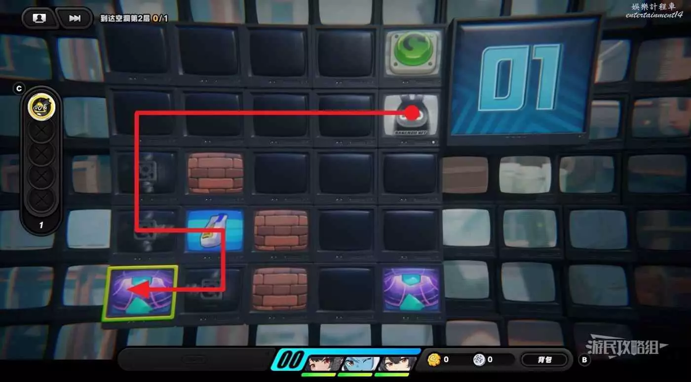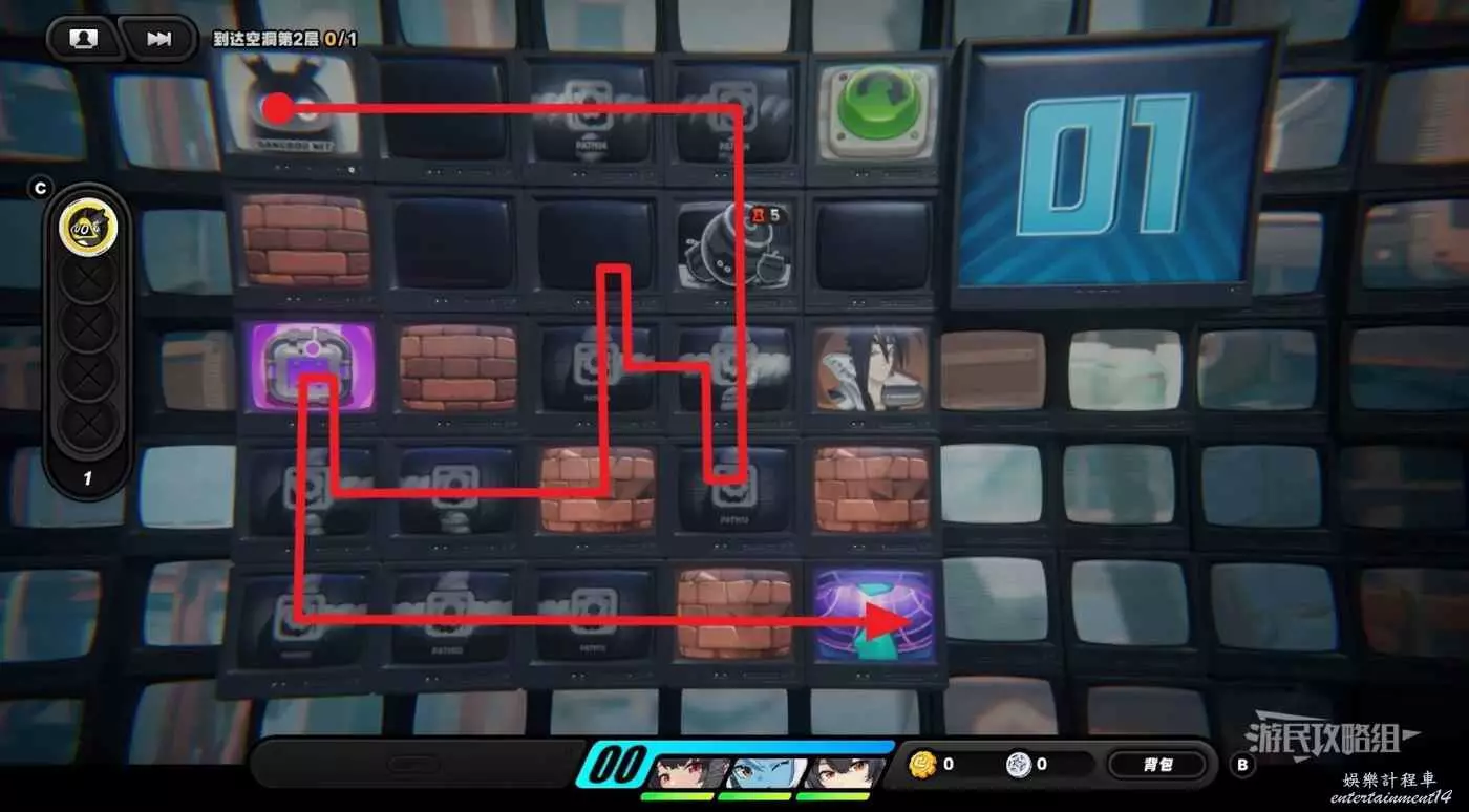 來到第二層,先往左走到頭拾取紫色物資,然後往上往右走到炸彈下方,把炸彈往上推一格,然後從右側繞到右上角拾取紫色物資,再走沒有走過的格子從炸開的缺口處進入傳送門。