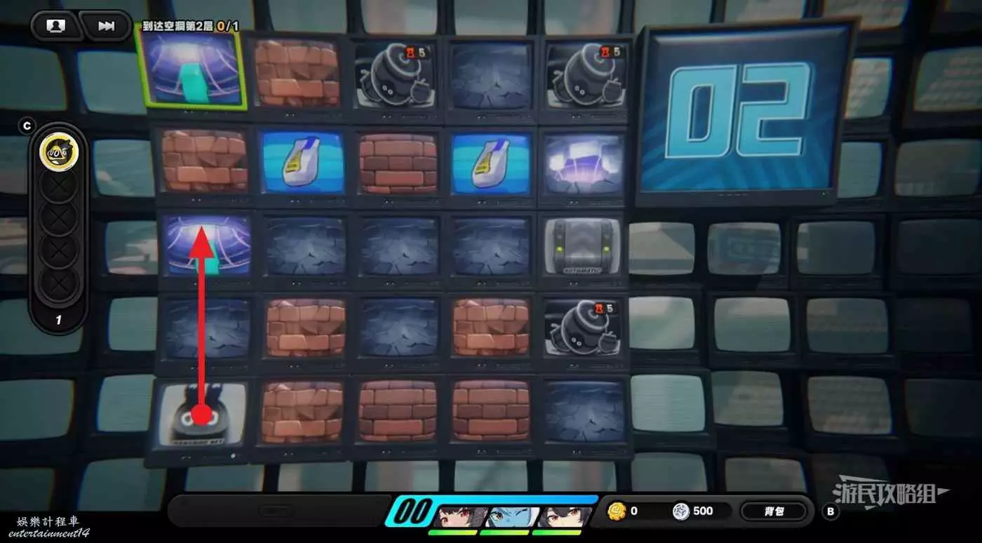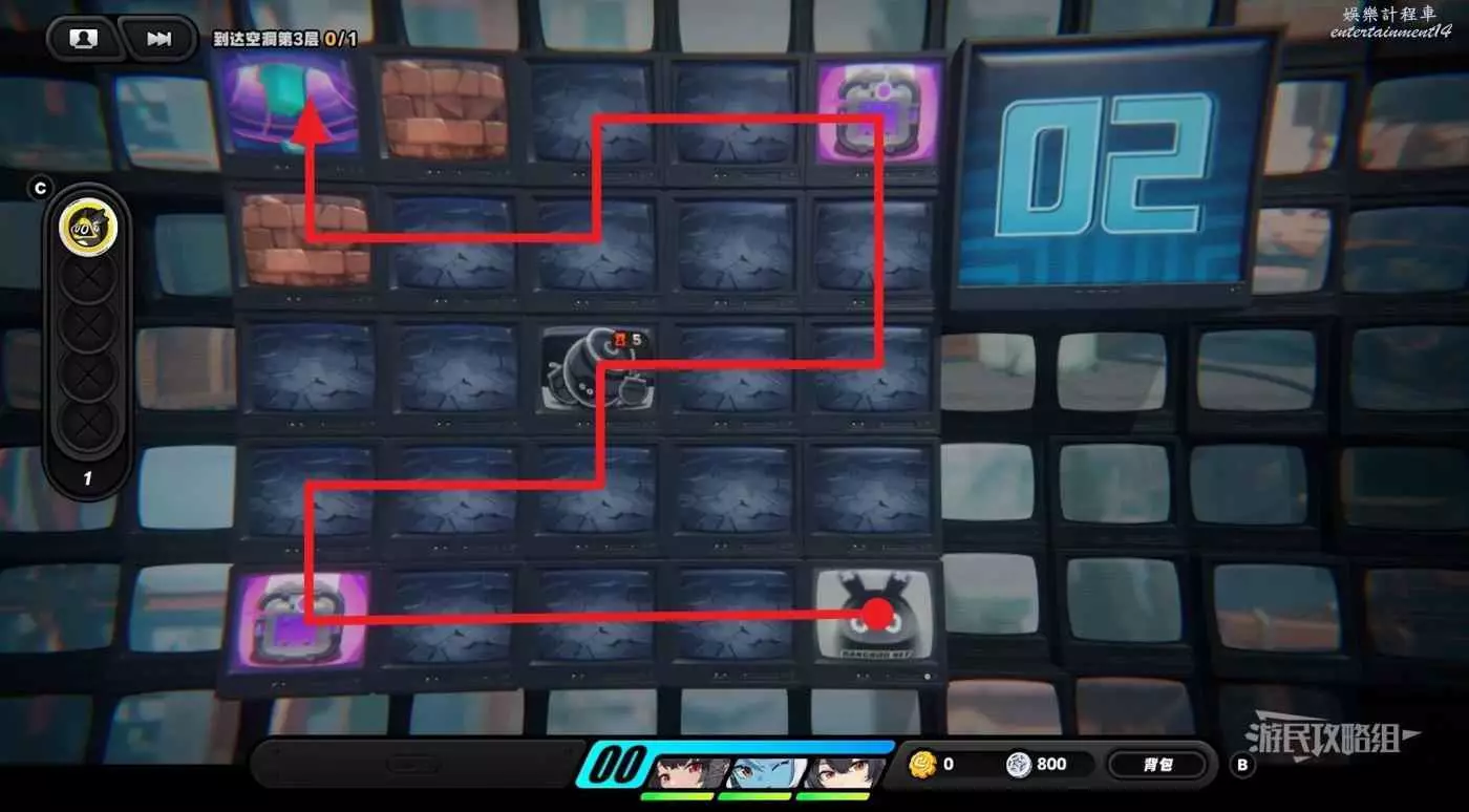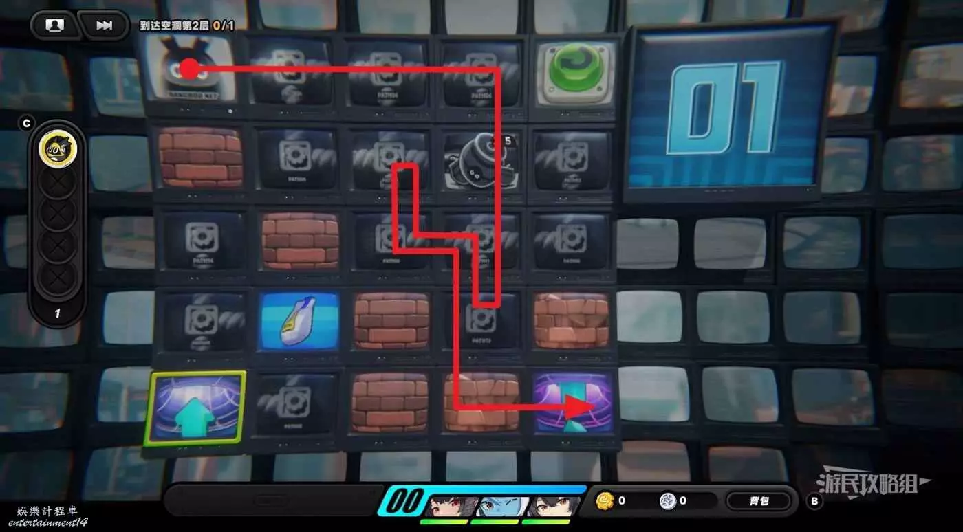 來到第二層,先往左走到頭拾取紫色物資,然後往上往右走到炸彈下方,把炸彈往上推一格,然後從右側繞到右上角拾取紫色物資,再走沒有走過的格子從炸開的缺口處進入傳送門。