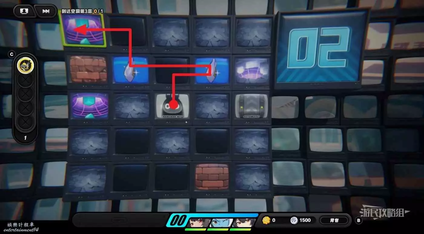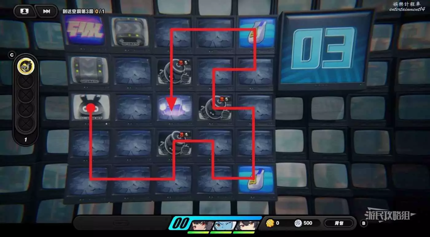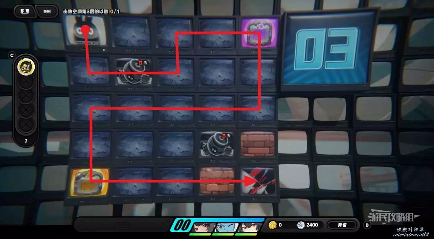 到達第三層後,往下走一格把炸彈往右推兩格,然後往上走拾取右上角紫色物資,再往下往左走到頭,繼續往下走兩格拾取黃色物資,最後往右走到頭進入傳送門。