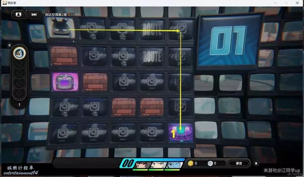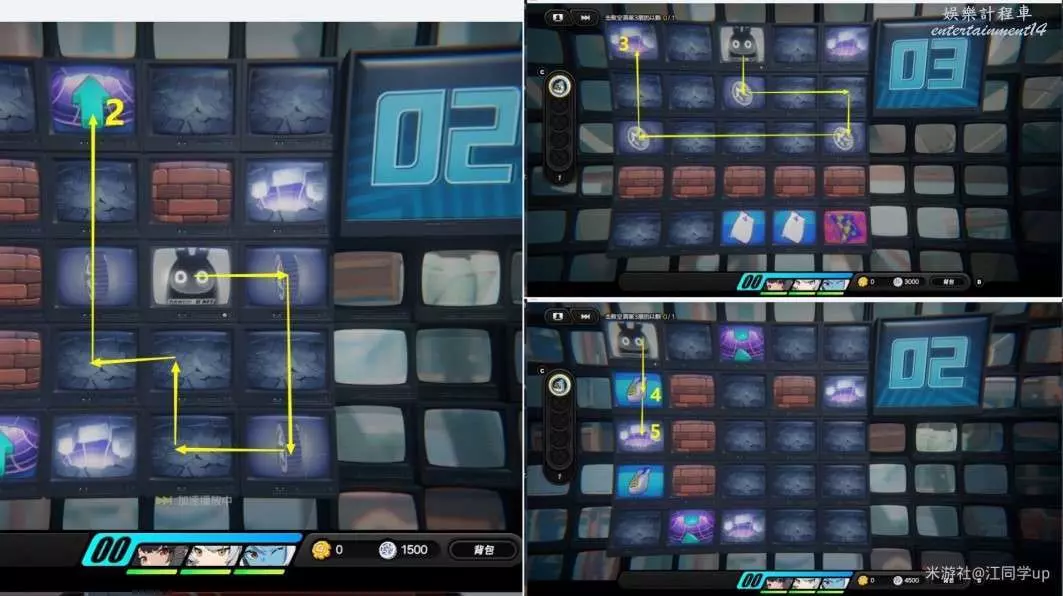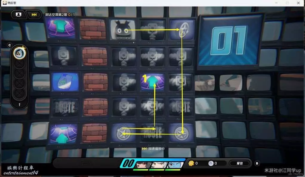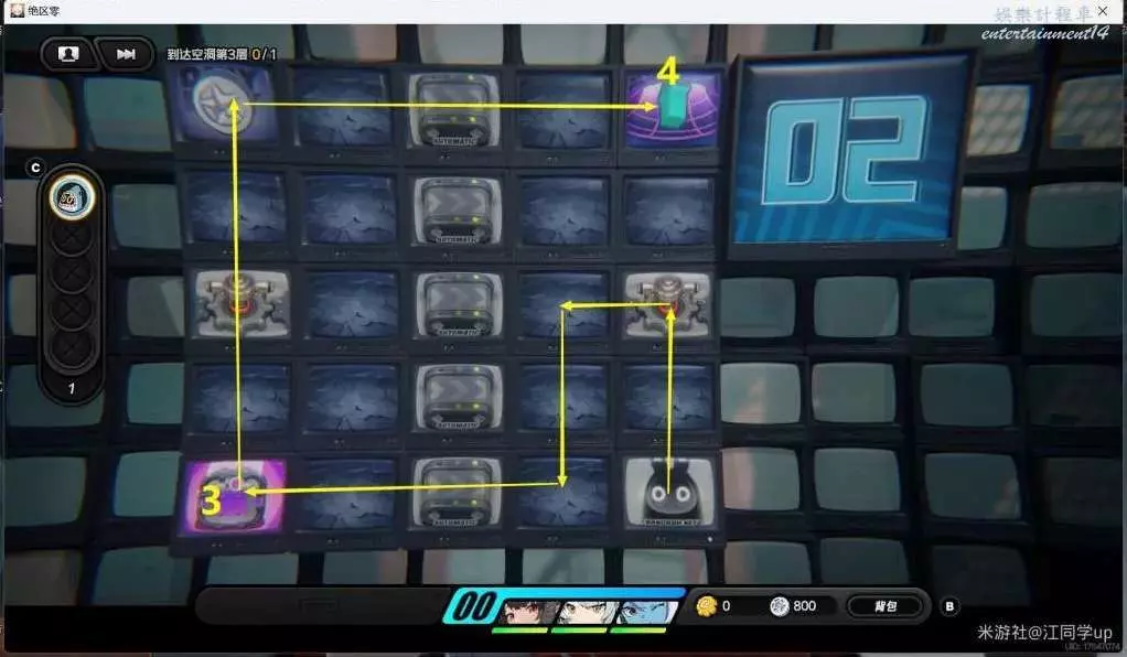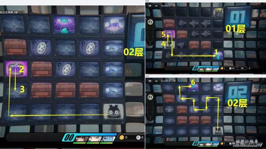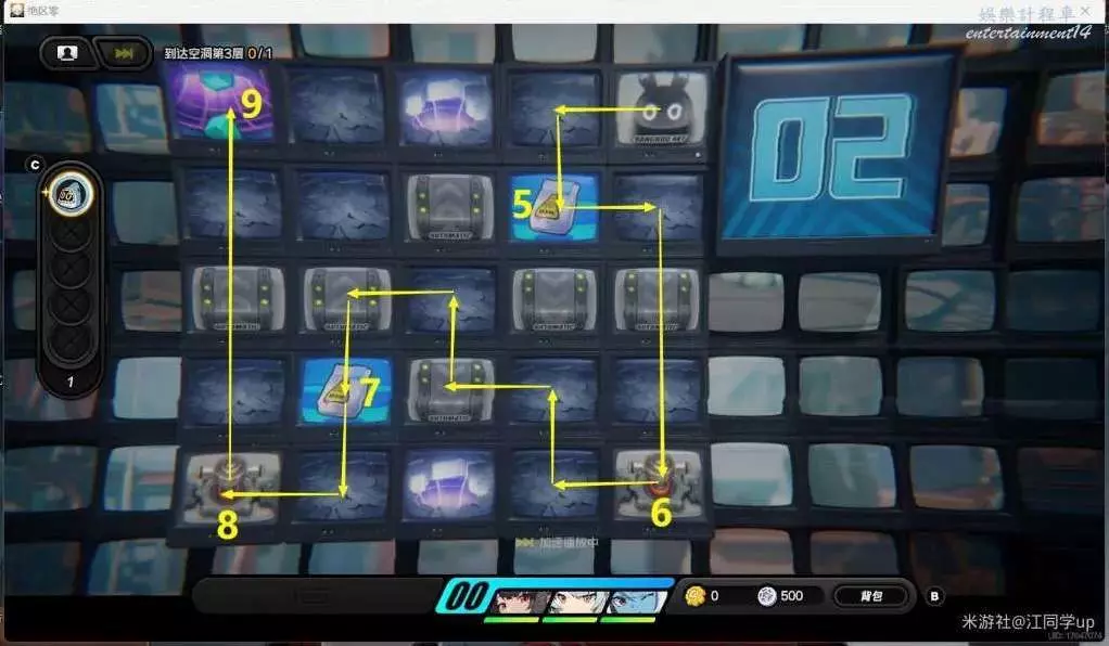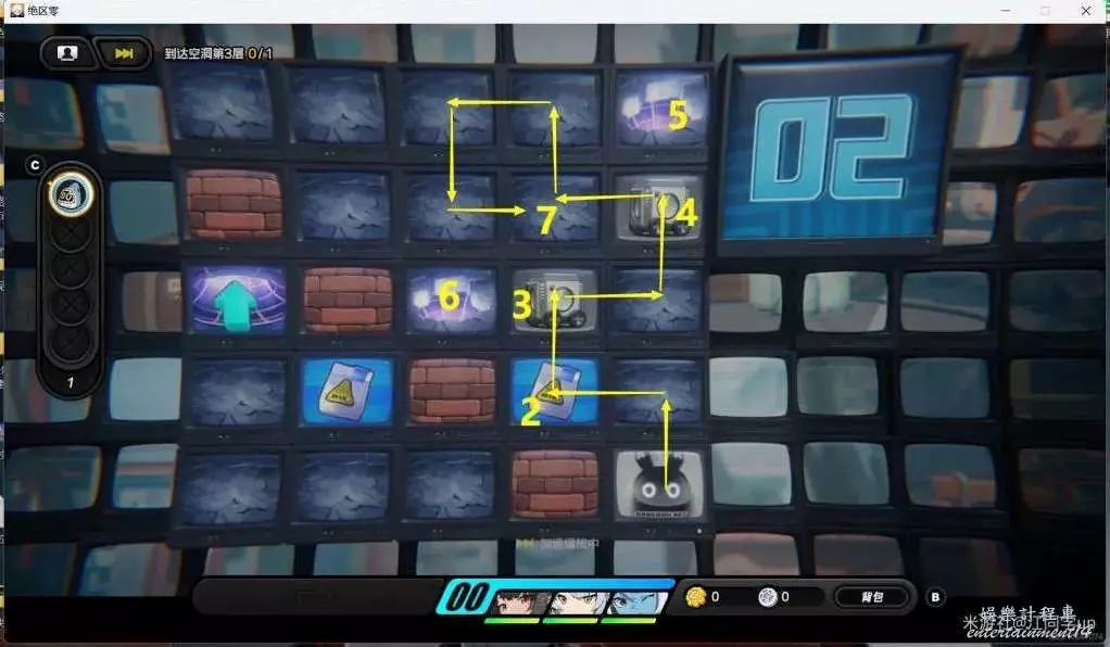 (2)到02層後,先去拿了2區域寶箱,接著返回下面3區域,就會從02層的3區域掉回到01層的4區域,然後上面拿了5區域寶箱後,再去1區域傳輸回到02層,接著按照下圖路線去7區域傳輸到03層,注意02層的每個格子只能走一遍,走第2遍就會掉回到01層