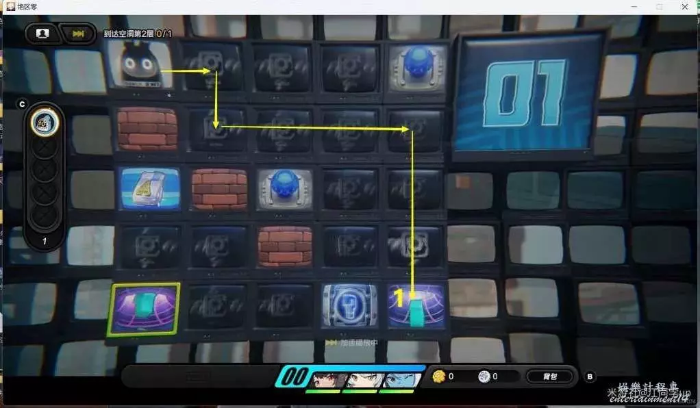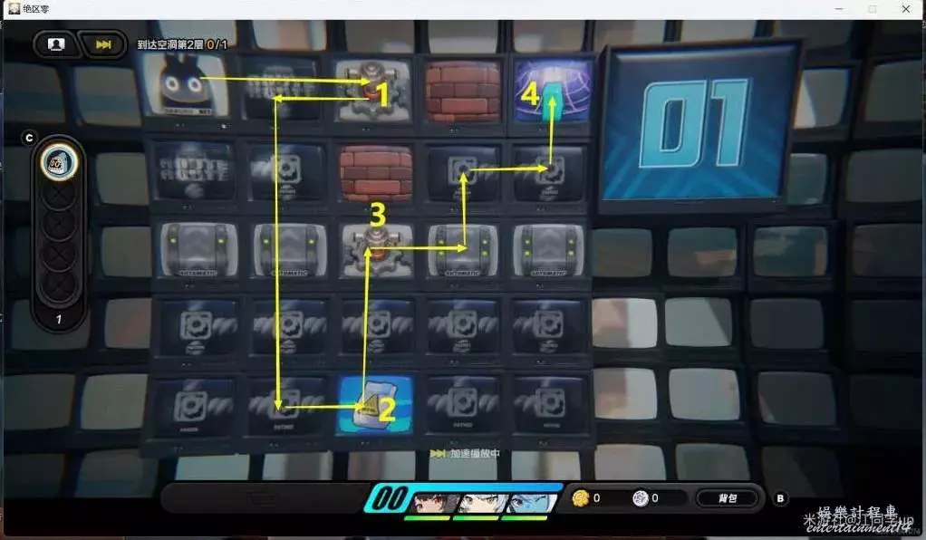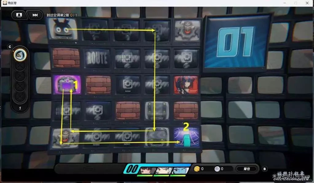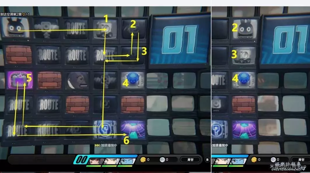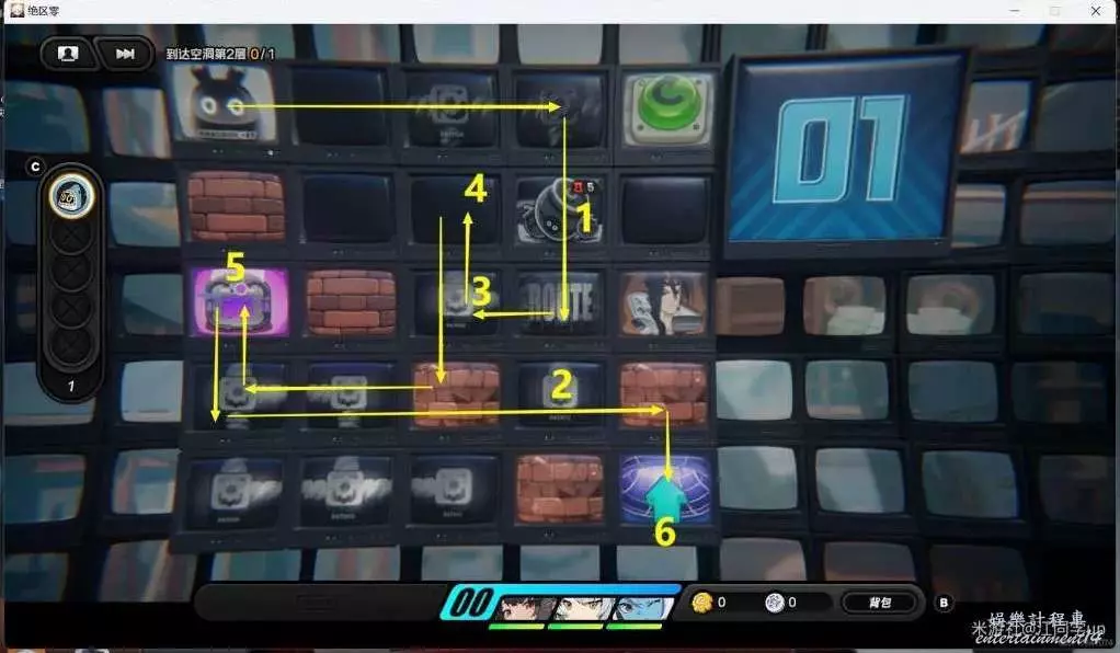 (1)進入副本後,先將1區域炸彈推到2區域,接著去3和4區域上下移動引爆2區域炸彈炸開2區域周圍的牆壁,然後再去5區域,最後再去6區域傳輸到02層