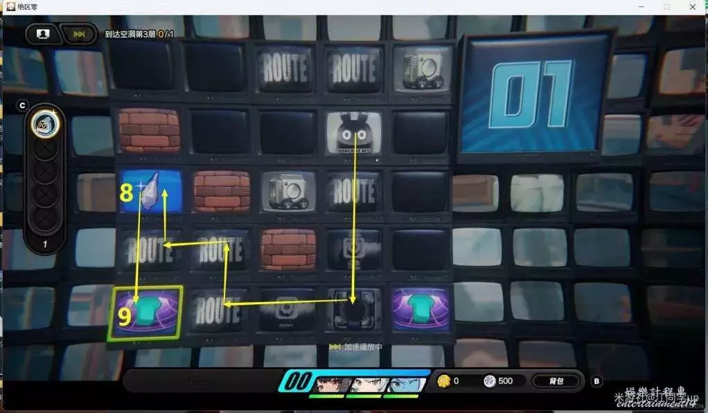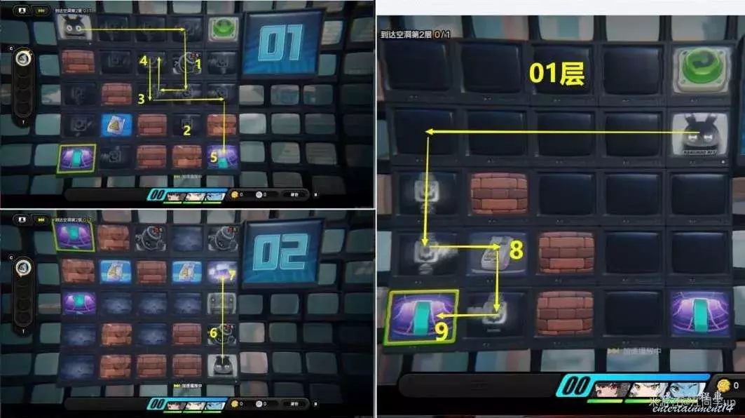 (1)進入副本後,先將1區域炸彈推到2區域,接著去3和4區域上下移動引爆2區域炸彈炸開2區域周圍的牆壁,然後再去5區域傳輸到02層,將02層6區域炸彈從7區域推下到01層後,我們也從7區域下到01層去,接著去拿了8區域資料樣本後,再從9區域傳輸到02層