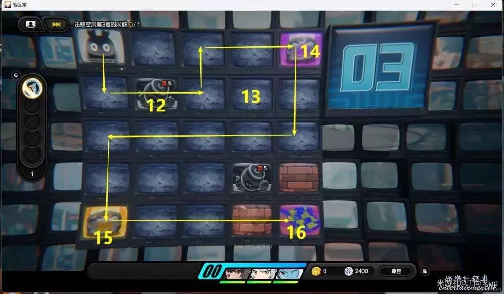 (3)到03層後,按照下圖路線走,將12區域炸彈推到13區域即可,最後去16區域打完怪後,副本結束
