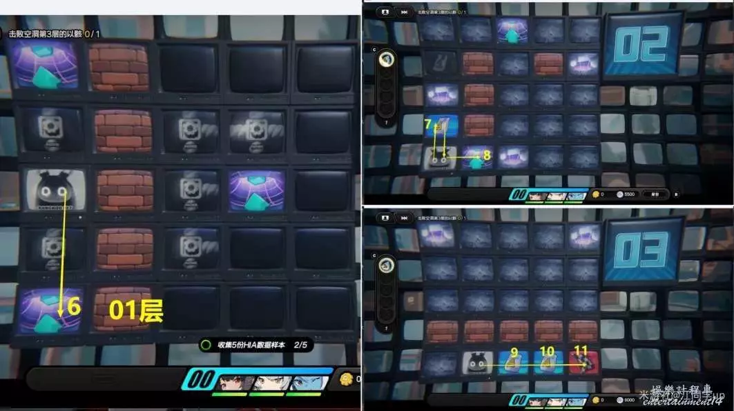 (3)到01層後,去6區域傳輸到02層,到02層後,先去7區域拿了資料樣本,接著去8區域傳輸到03層,到03層後,拿了9和10區域資料樣本,最後去11區域打完怪後,副本結束