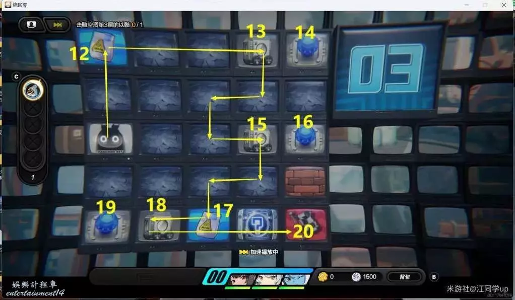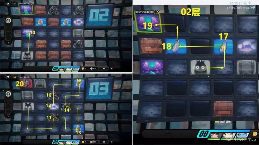 (2)到02層後,直接去10區域傳輸到03層,到03層後,按照下圖路線依次將11,14和16區域的炸彈都從12區域推下去,最後我們也從12區域去下面02層,接著去拿了17和18區域資料樣本後,從19區域會直接傳送到03層的20區域,最後在20區域打完怪後,副本結束