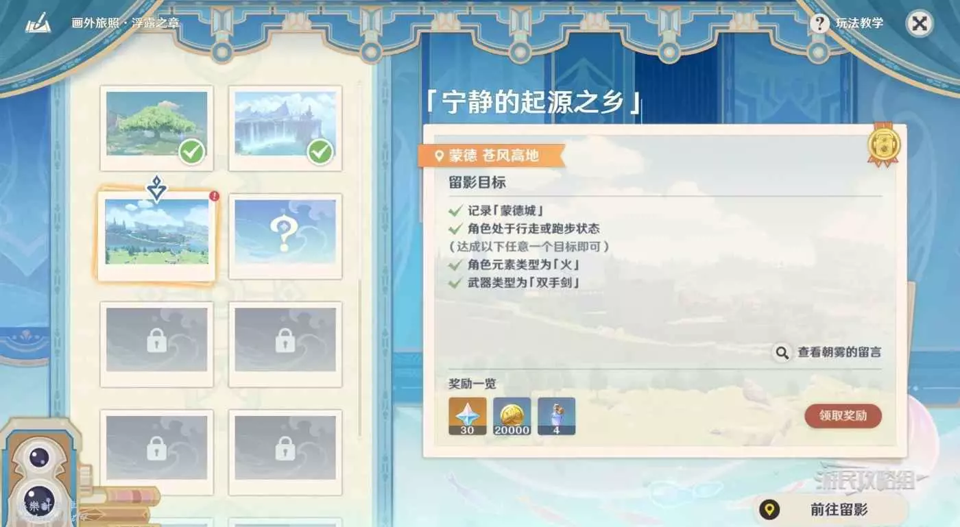 在角色行走或跑動時拍照即可,注意前方懸崖不要走下去,建議往鏡頭方向走(即使跑太快角色沒有出現在鏡頭裡也算完成)。如果怕拍不到的話也可以在留影設置時點擊左上角打開連拍模式。