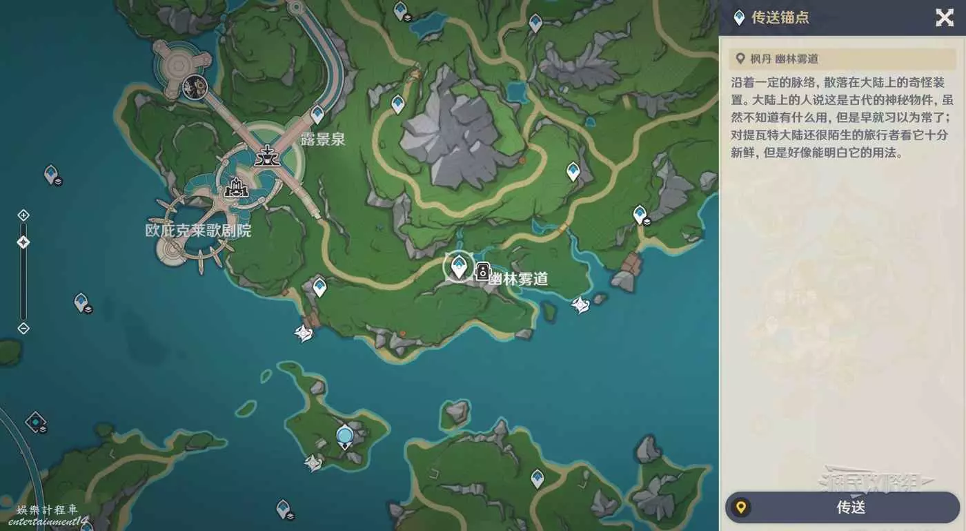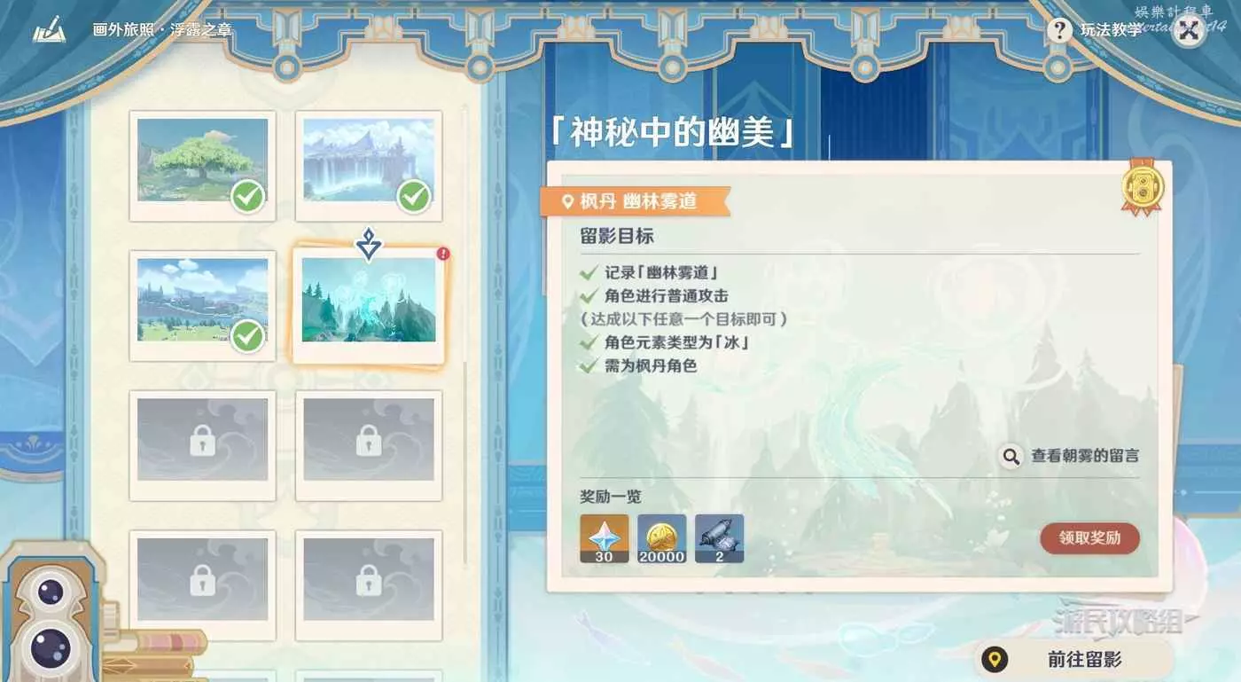 第四關的位置在楓丹幽林霧道,直接傳送到幽林霧道旁邊的錨點,前往拍照位置即可。建議提前清掉附近的水史萊姆。