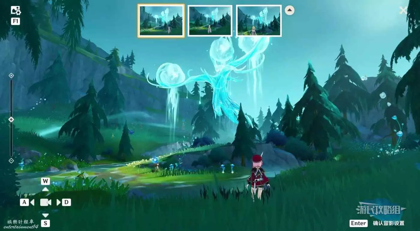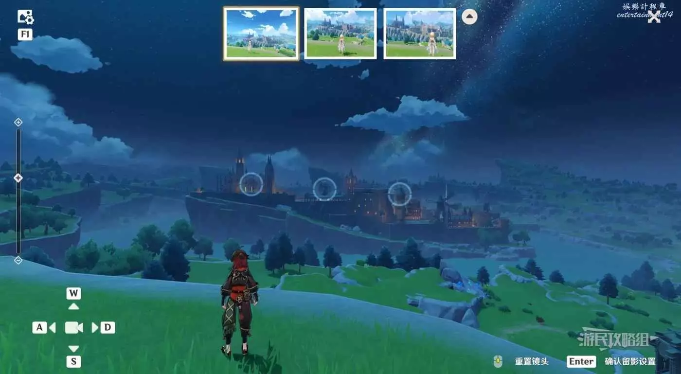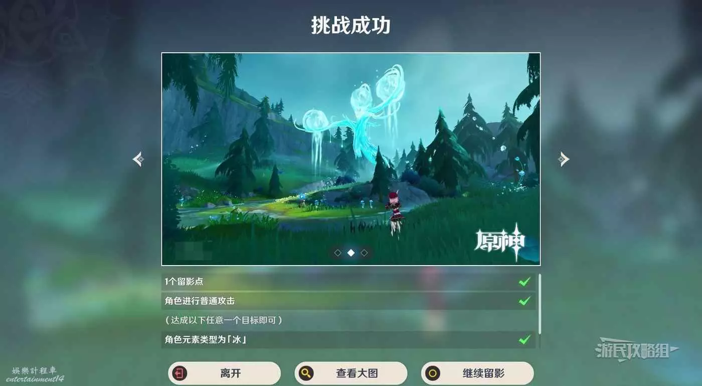 角色選擇夏洛蒂/菲米尼(滿足任意一個條件即可:選擇任意冰元素角色,選擇任意楓丹角色),將三個圓點保持在鏡頭內,可以直接點擊上方三種角度,然後點擊右下角保存留影設置。