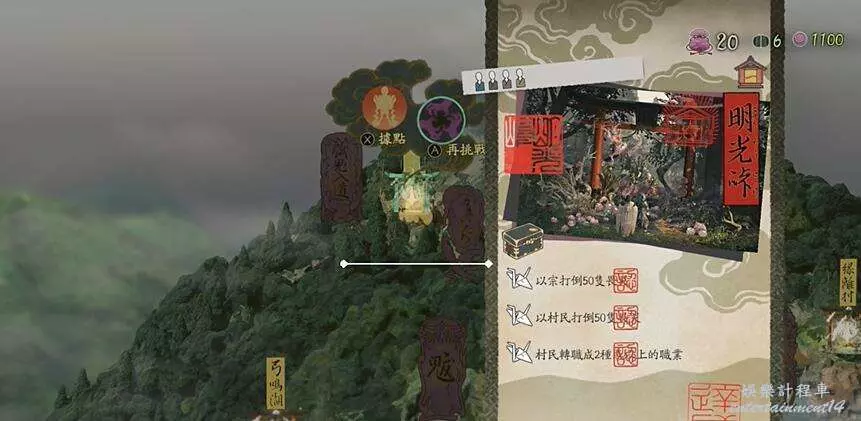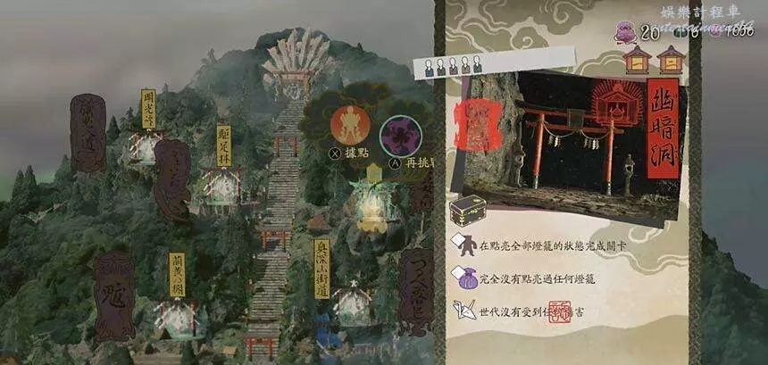 例如:右上角能顯示沒關清理所有污穢後獲得的魔像,全部取得會有紅色印章,關卡內寶箱獲取完後頁面的寶箱會開啟,三個特別挑戰完成後會在右下角出現大印章。