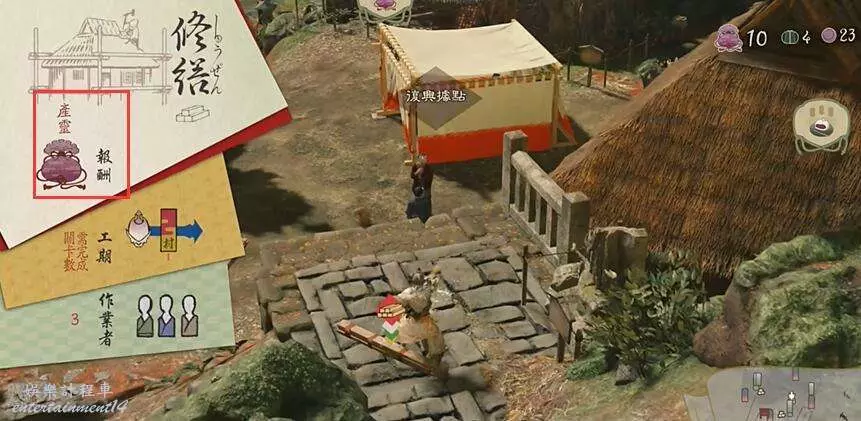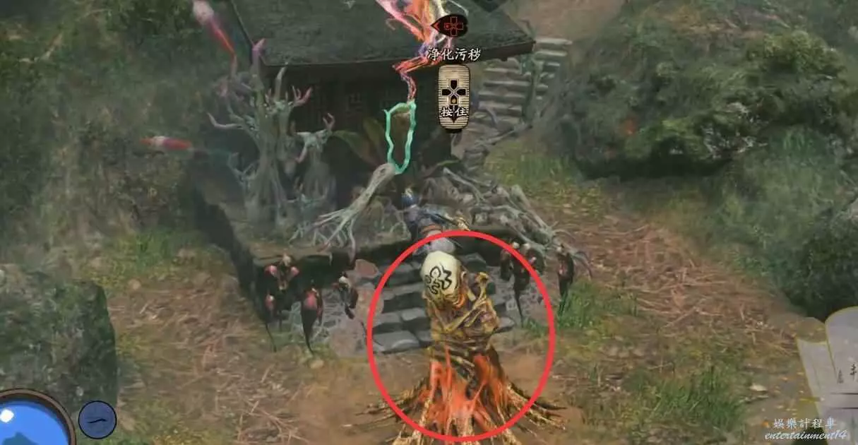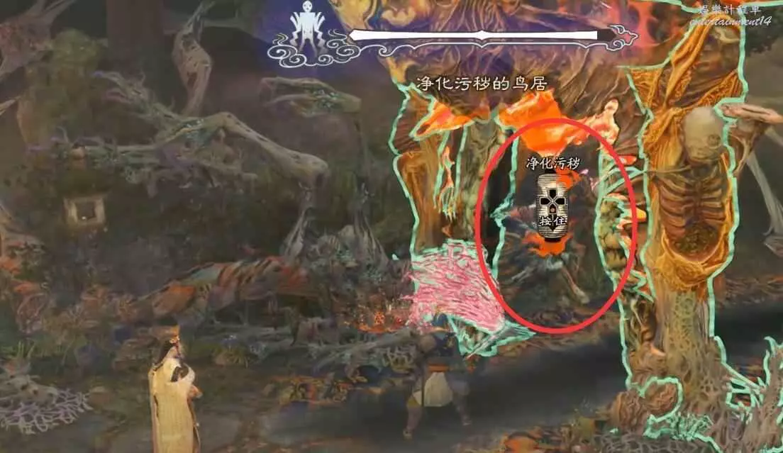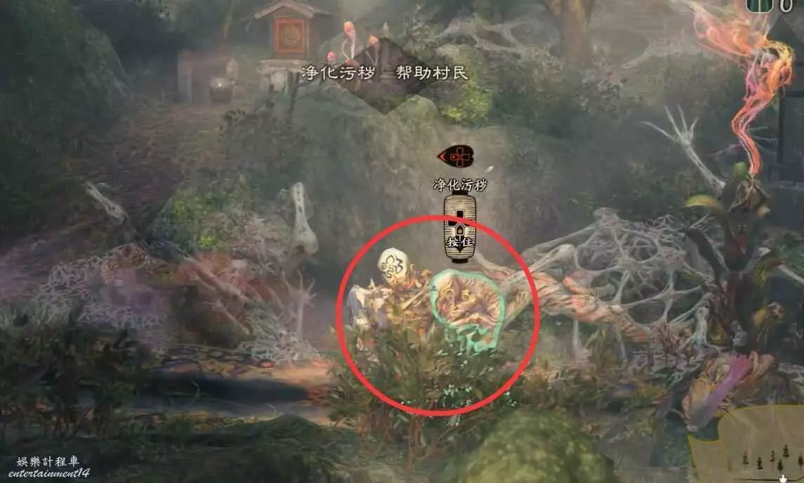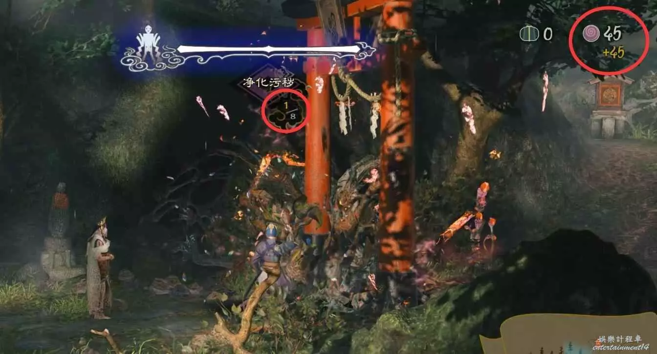 岔路上有個神祠,靠近會顯示玩家已經淨化的污穢數量及總數,把該地圖的污穢清理後可以到這裡領取獎勵
