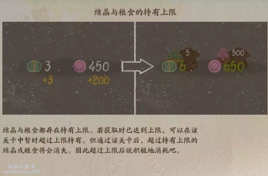 結晶和糧食存在持有上限,在該關卡中可以暫時超過上限持有,但通過該關卡後,超過部分會消失