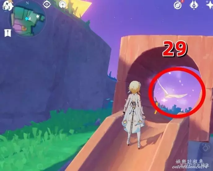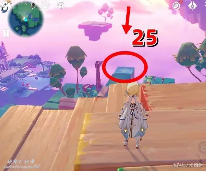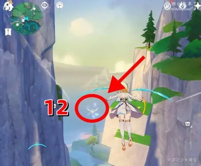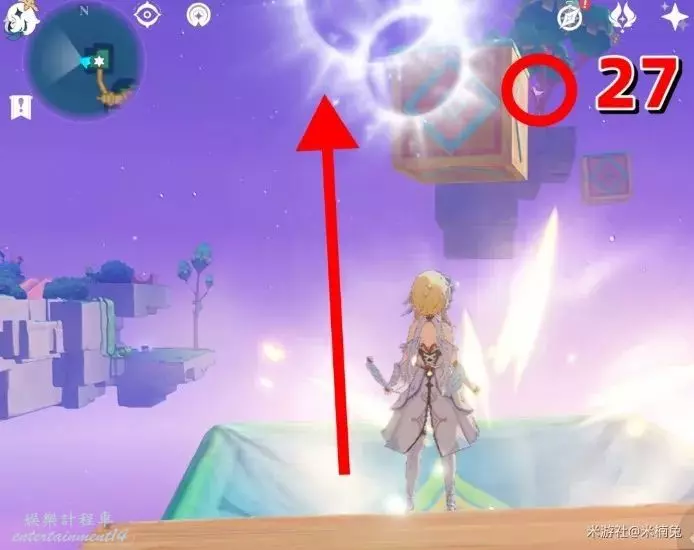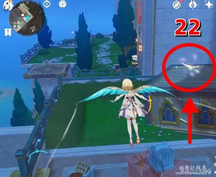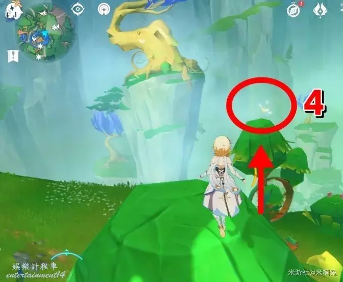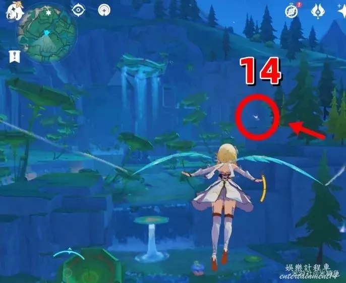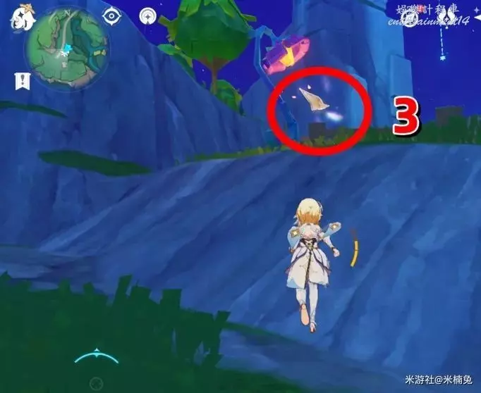 最後看向【西方向】小地圖的【左邊】,借用彈跳箱子出現的風場,飛到該方向的島上有1個