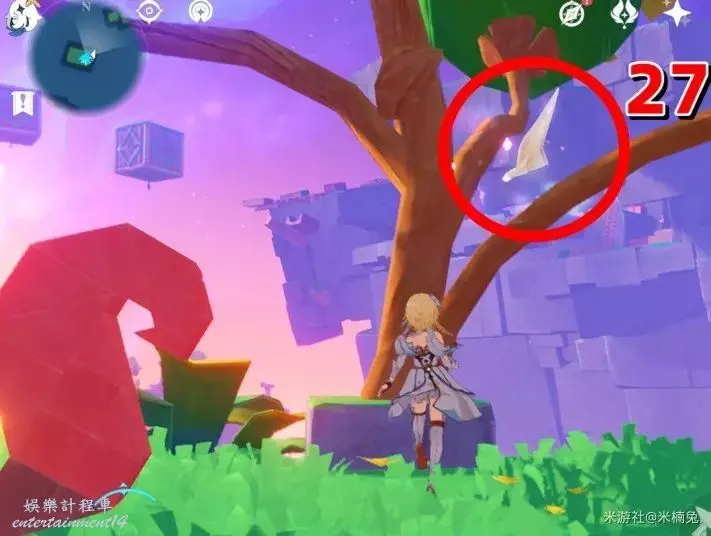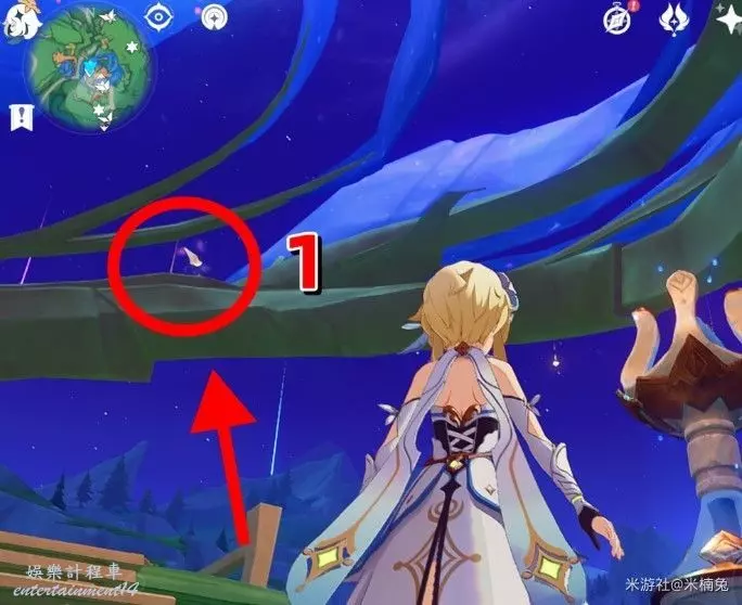 視角轉向【南方向】小地圖的【下方】,在錨點上方的樹枝上有1個