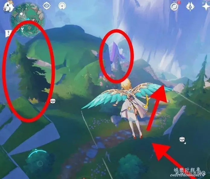 第二個,將視角轉向【西方向】小地圖的【左邊】,往對面山坡上飛過去