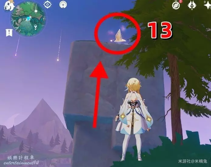 視角轉向【東方向】小地圖的【右邊】,在該方向後邊的樹葉頂上有1個