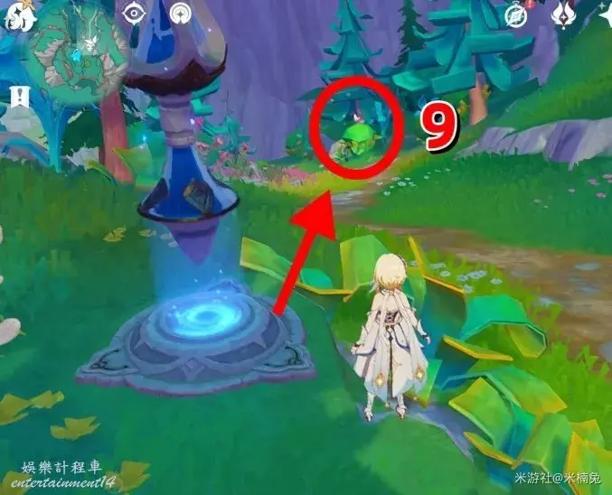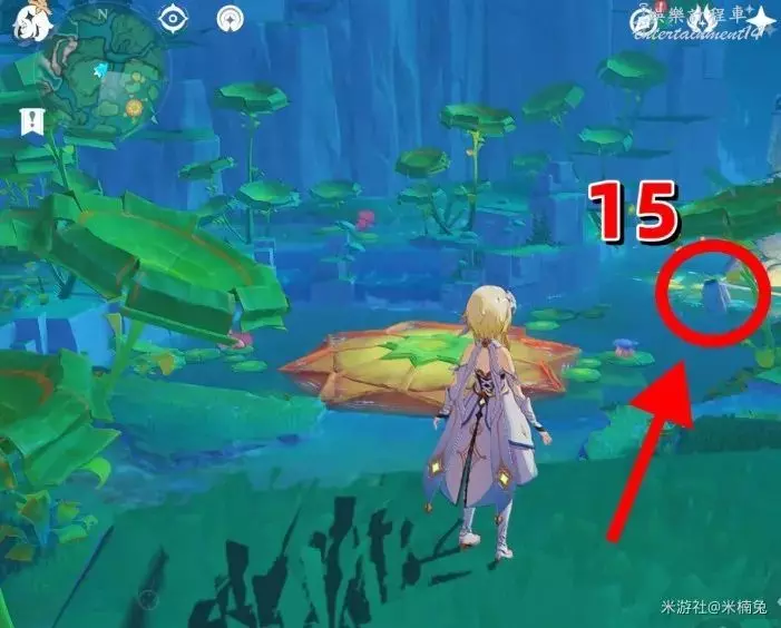 將視角轉向【東南方向】小地圖【右下角】,在水潭中間,青蛙石門前的石頭上有1個
