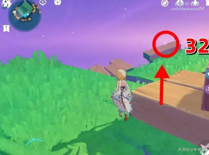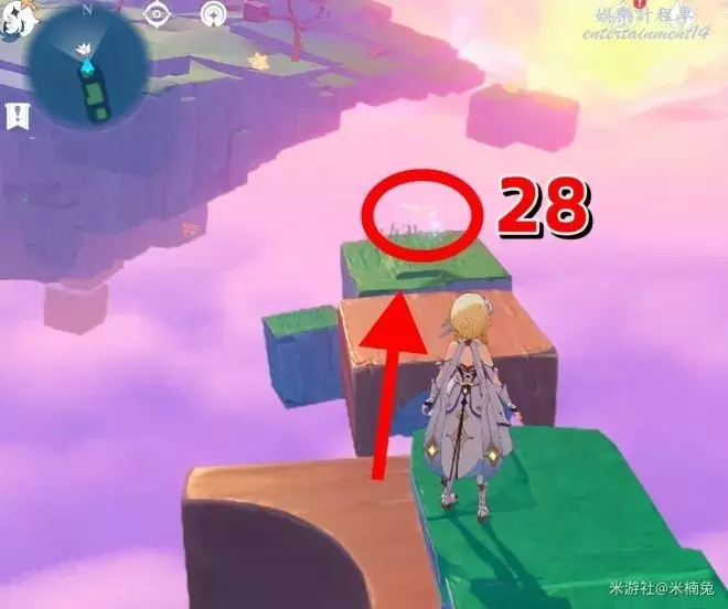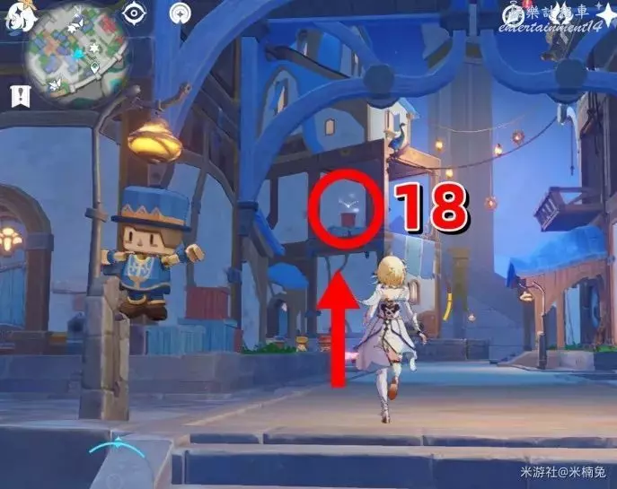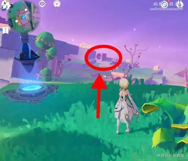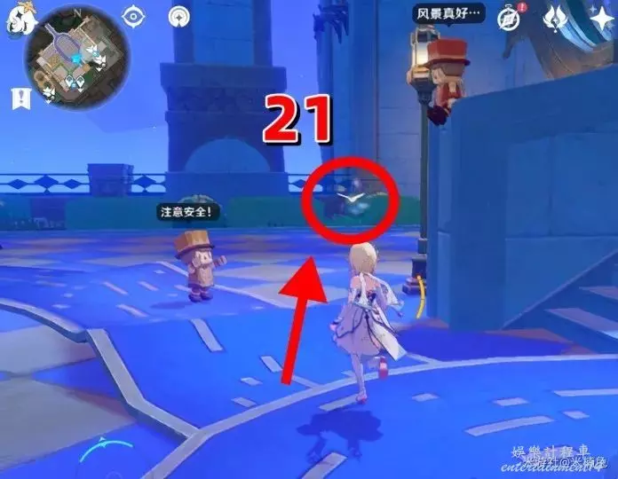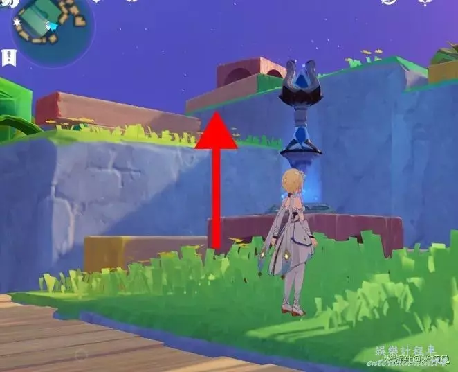 然後傳送回剛才的錨點,看向【西方向】小地圖的【左邊】,兩積木小人的頭頂上有1個