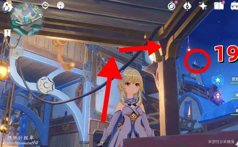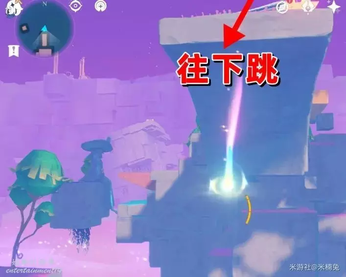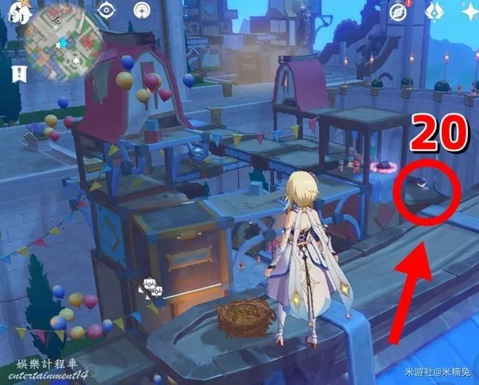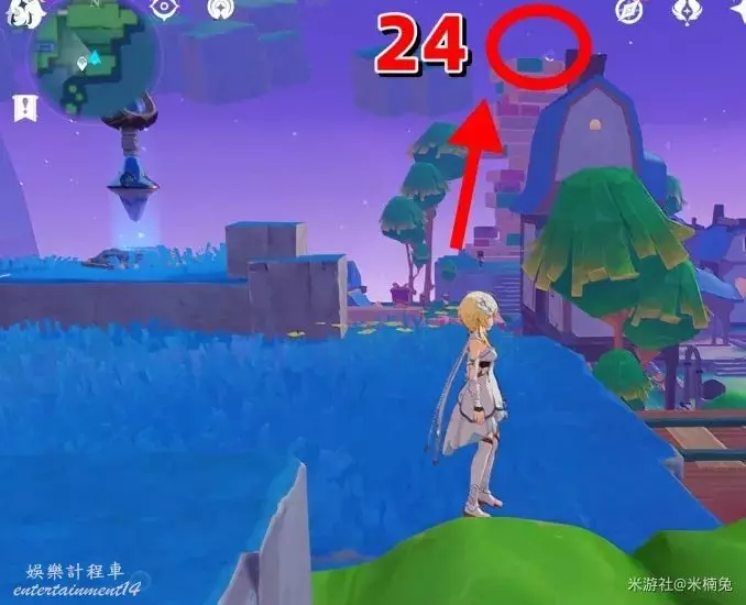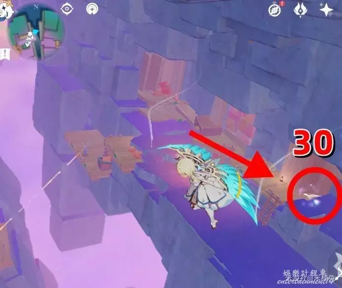 站在房頂上,視角往【西方向】小地圖的【左邊】看,飛往紫色大花下的飛鼠活動挑戰台