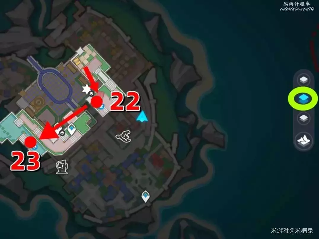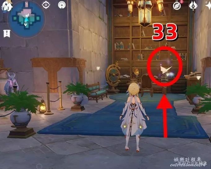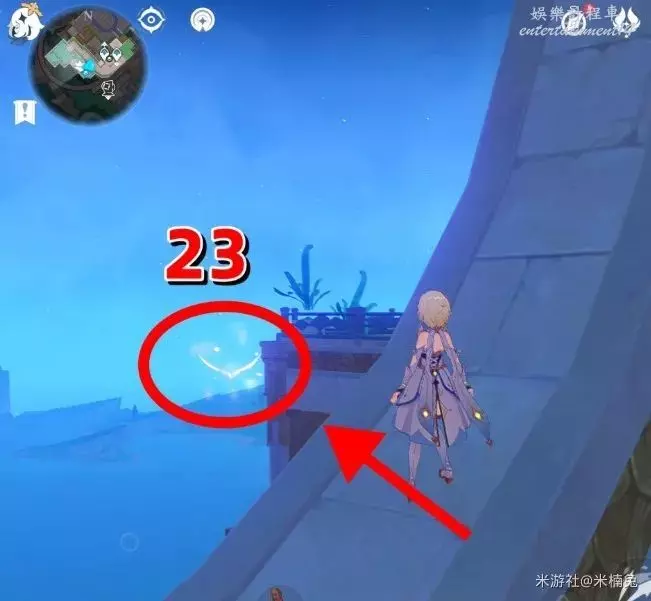 之後將視角轉向【西北方向】小地圖的【左上角】,在該方向的房頂上有1個