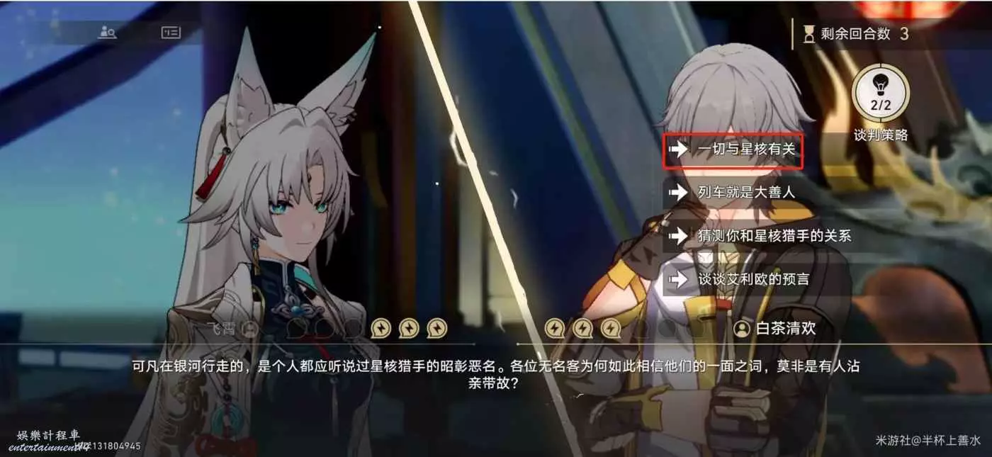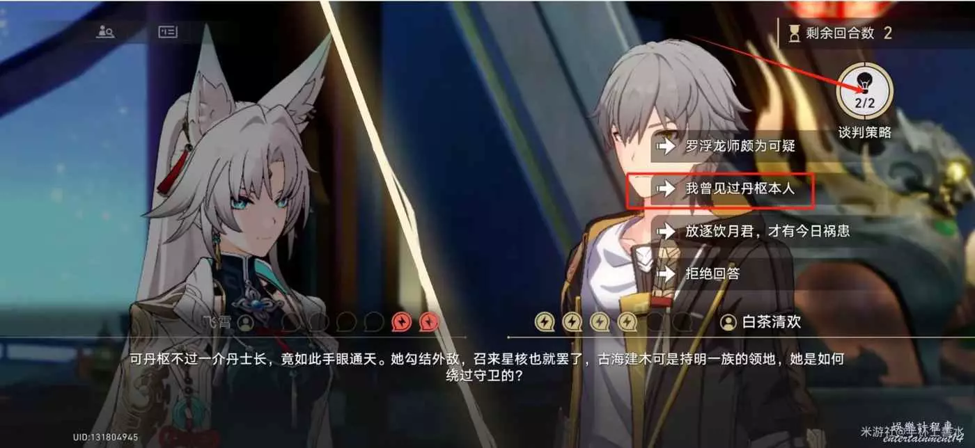 第二回合:選擇【我曾見過丹恒本人】,可以先選擇談判策略裡面【情緒調動】再做選擇即可直接談判成功。