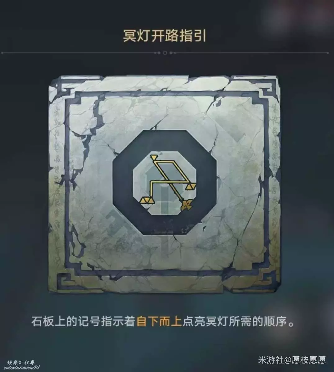 如圖,將冥燈自下而上點亮即可,如果點錯了重新開始就好了(由於忘記在解謎環節中截圖所以只有一個圖片)
