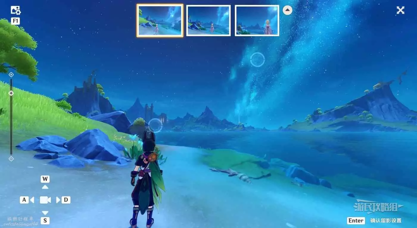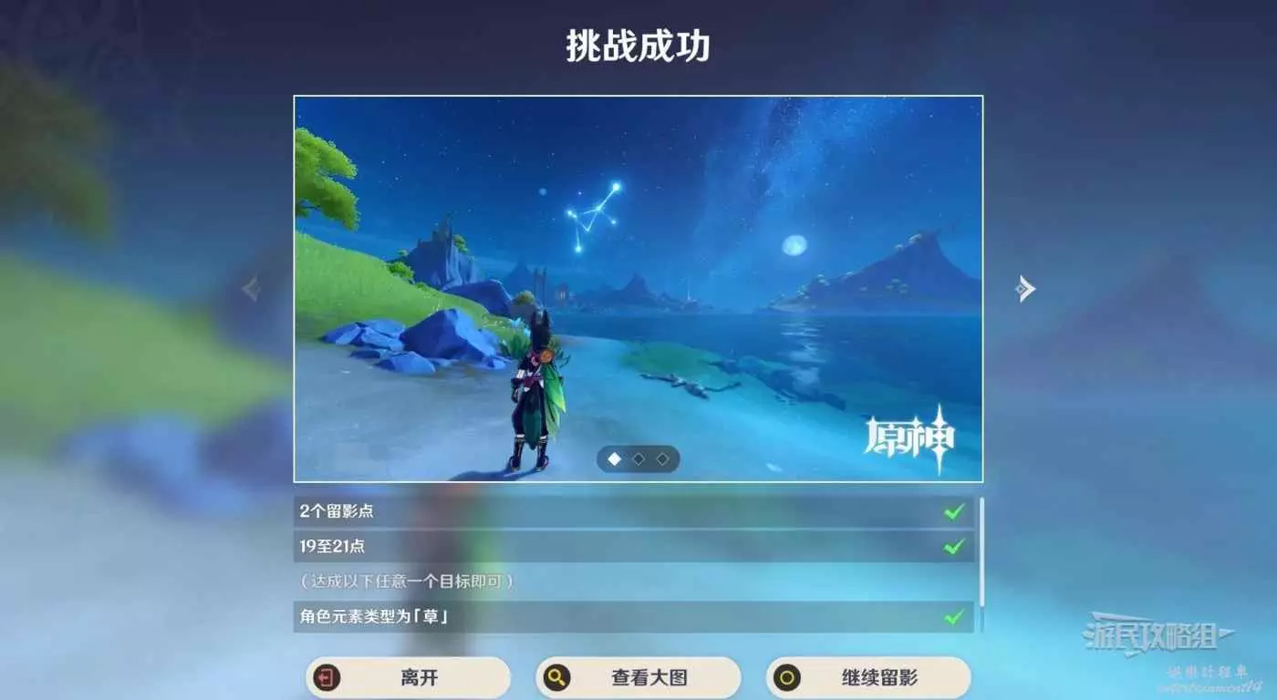 角色選擇柯萊/提納裡等(滿足任意一個條件即可:選擇任意草元素角色,選擇任意弓角色),將所有圓點保持在鏡頭內,可以直接點擊上方三種角度,然後點擊右下角保存留影設置。
