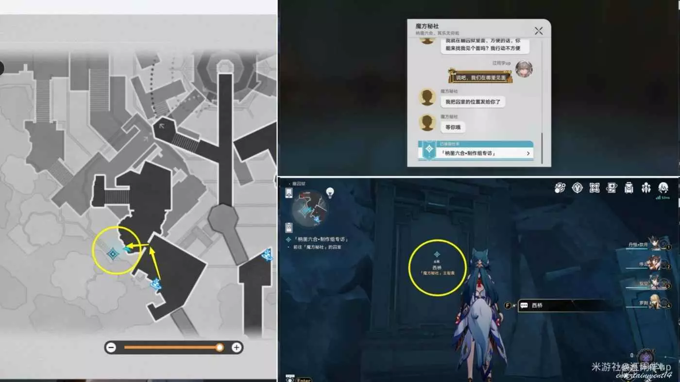 2、當完成上面第1輪6個魔方解密後,我們就會收到【魔方秘社】的短信並接到任務【枘鑿六合·製作組專訪】,接著追蹤任務來到下圖位置和【西橋】對話,提交第1輪6個魔方解密獲得的6個道具【魔方戰令】後,上圖6個魔方的解密就會刷新,接著就可以開始第2輪6個魔方的解密了,6個魔方位置是不變的,完成第2輪6個魔方的解密後,再次回到到下圖位置和【西橋】對話並提交第2輪6個【魔方戰令】後,即可獲得隱藏成就《能和我轉一輩子魔方嗎》