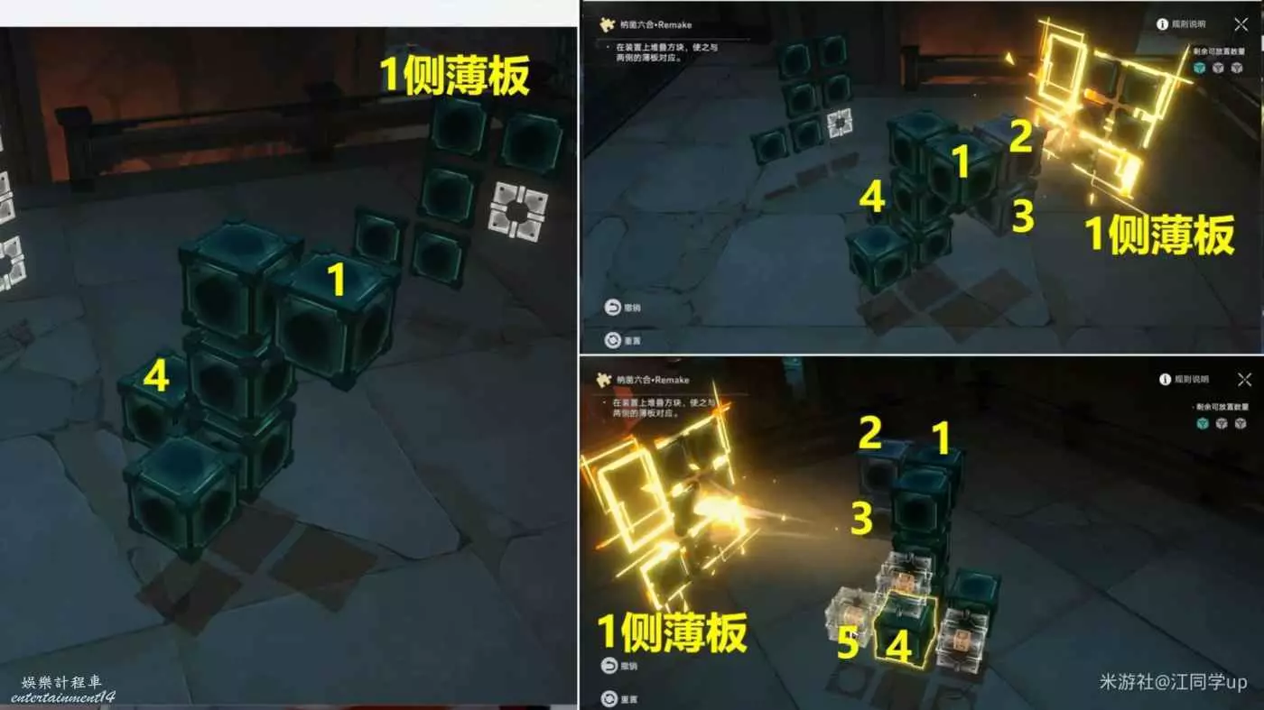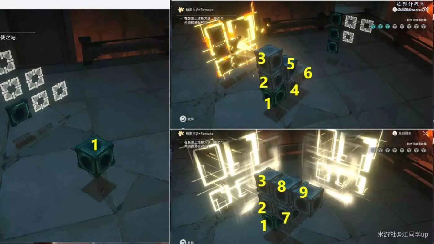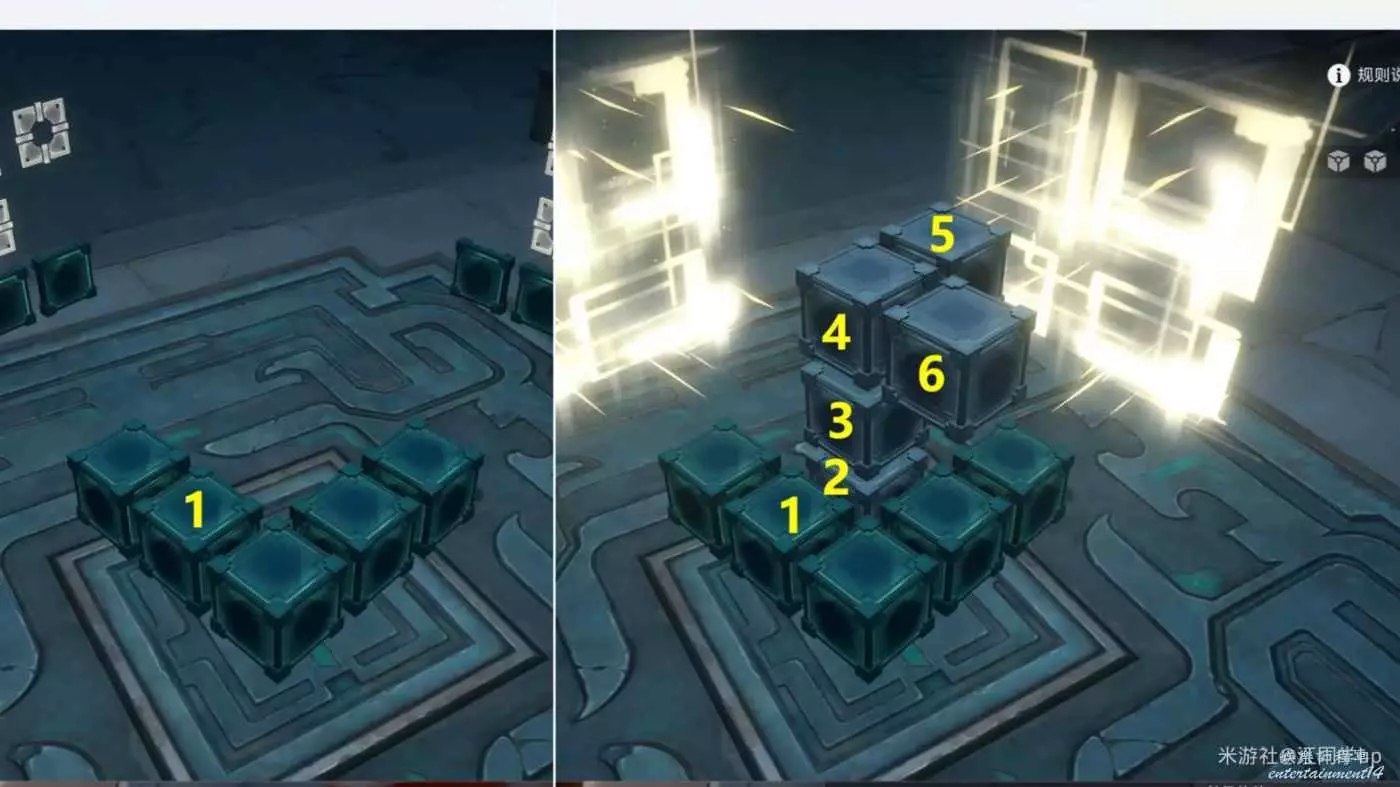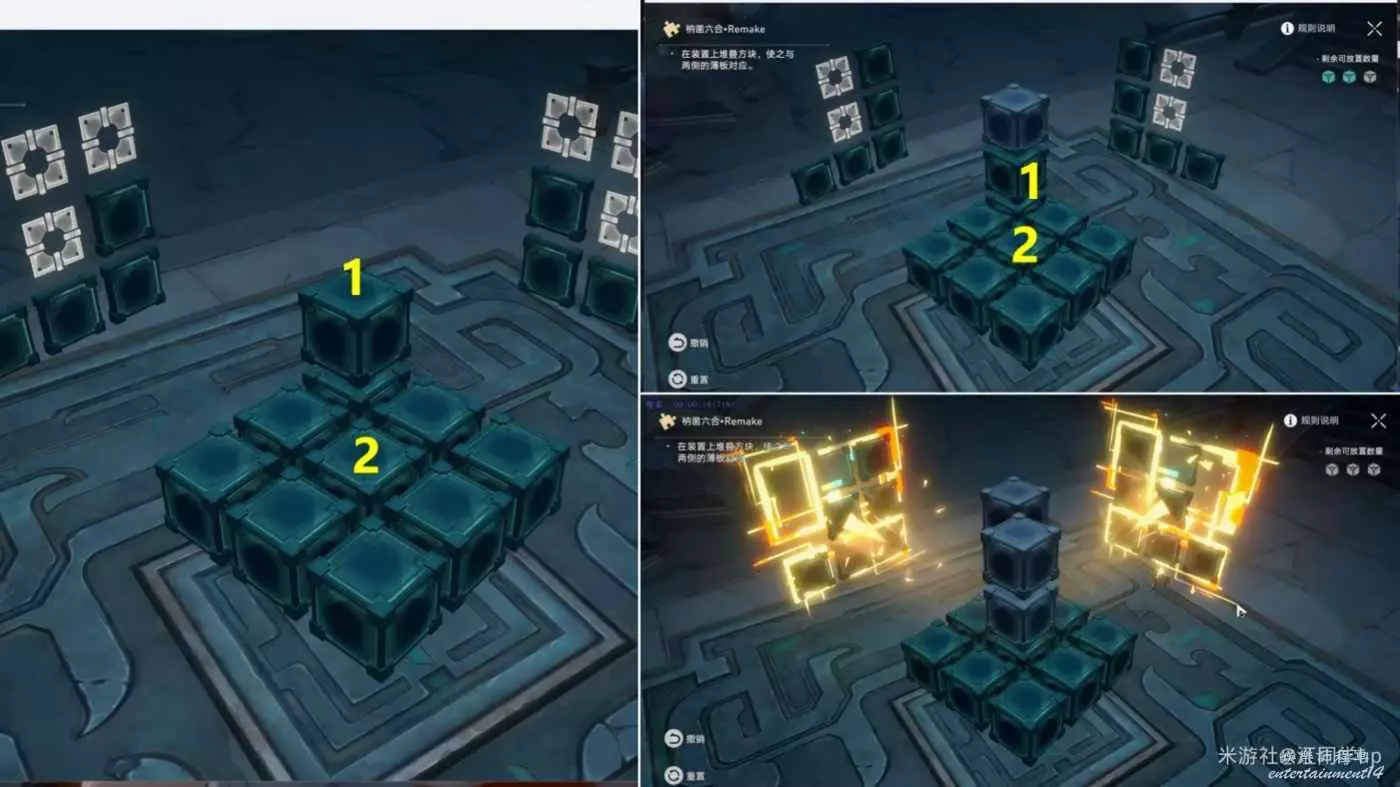 (2)我拿第1個魔方解密給大家說明一下,先點擊1位置方塊後,1位置方塊上面就會出現2方塊虛影,接著點擊2方塊虛影后,就會將2方塊放到了1位置方塊上面了,以此類推,繼續點擊2方塊後出現3方塊虛影,接著點擊3方塊虛影后,就會將3方塊放到了2位置方塊上面了,這時中間裝置造型與兩側薄板裝置對應後,即可完成解密