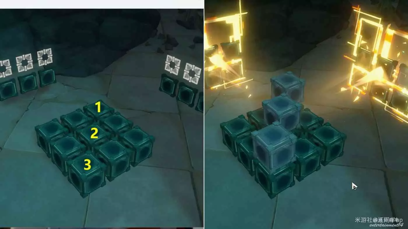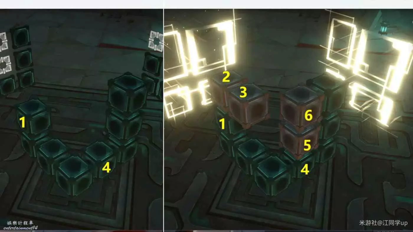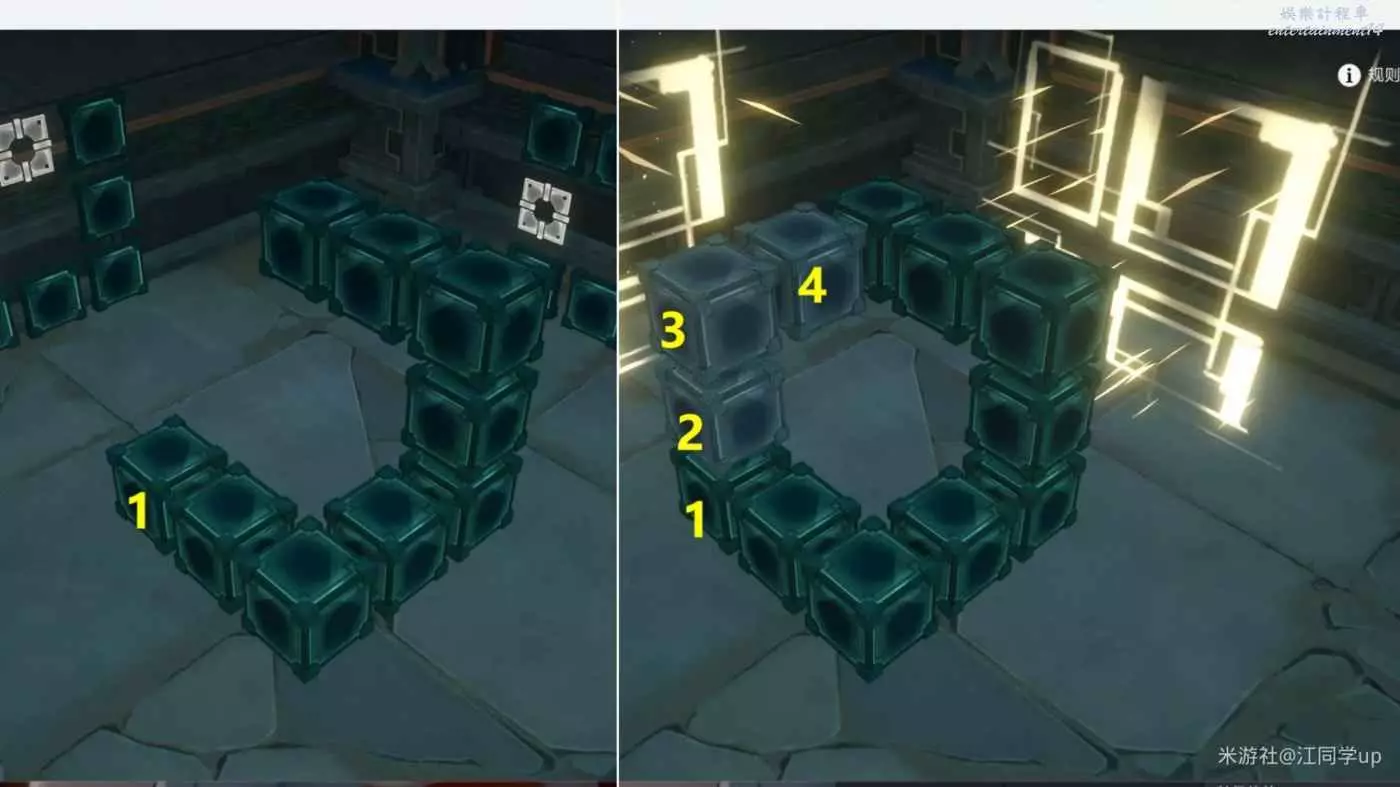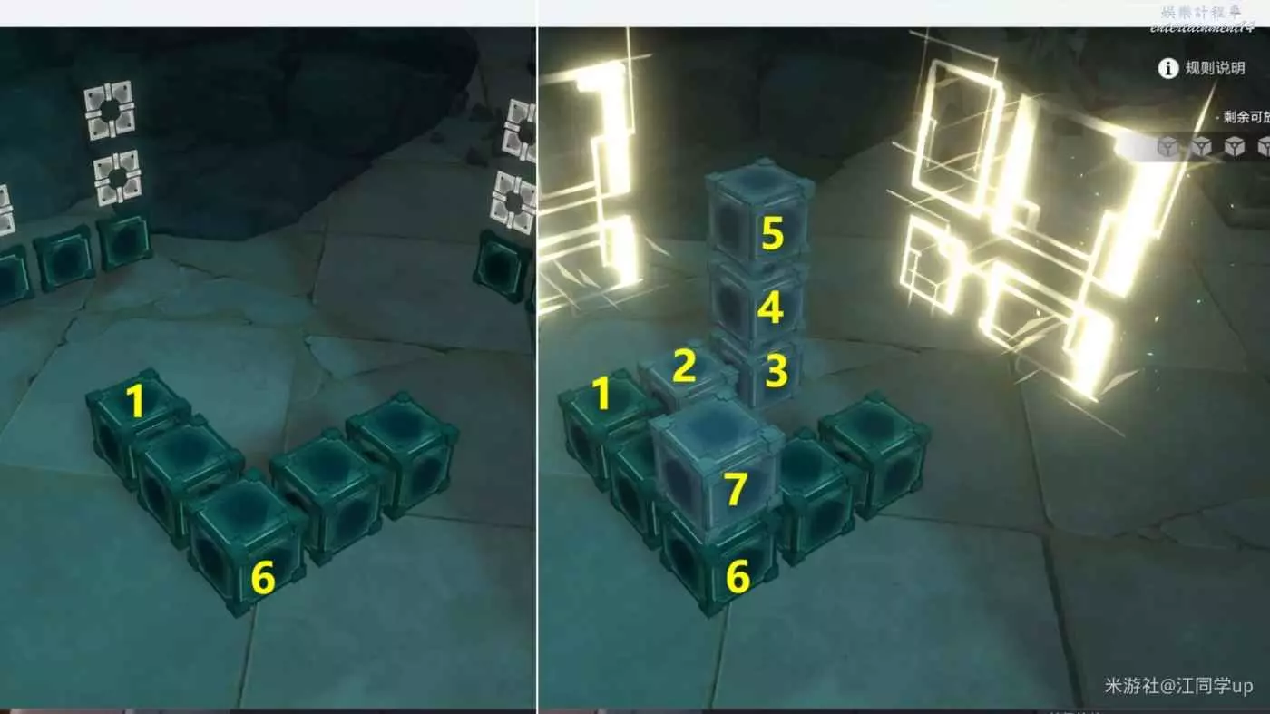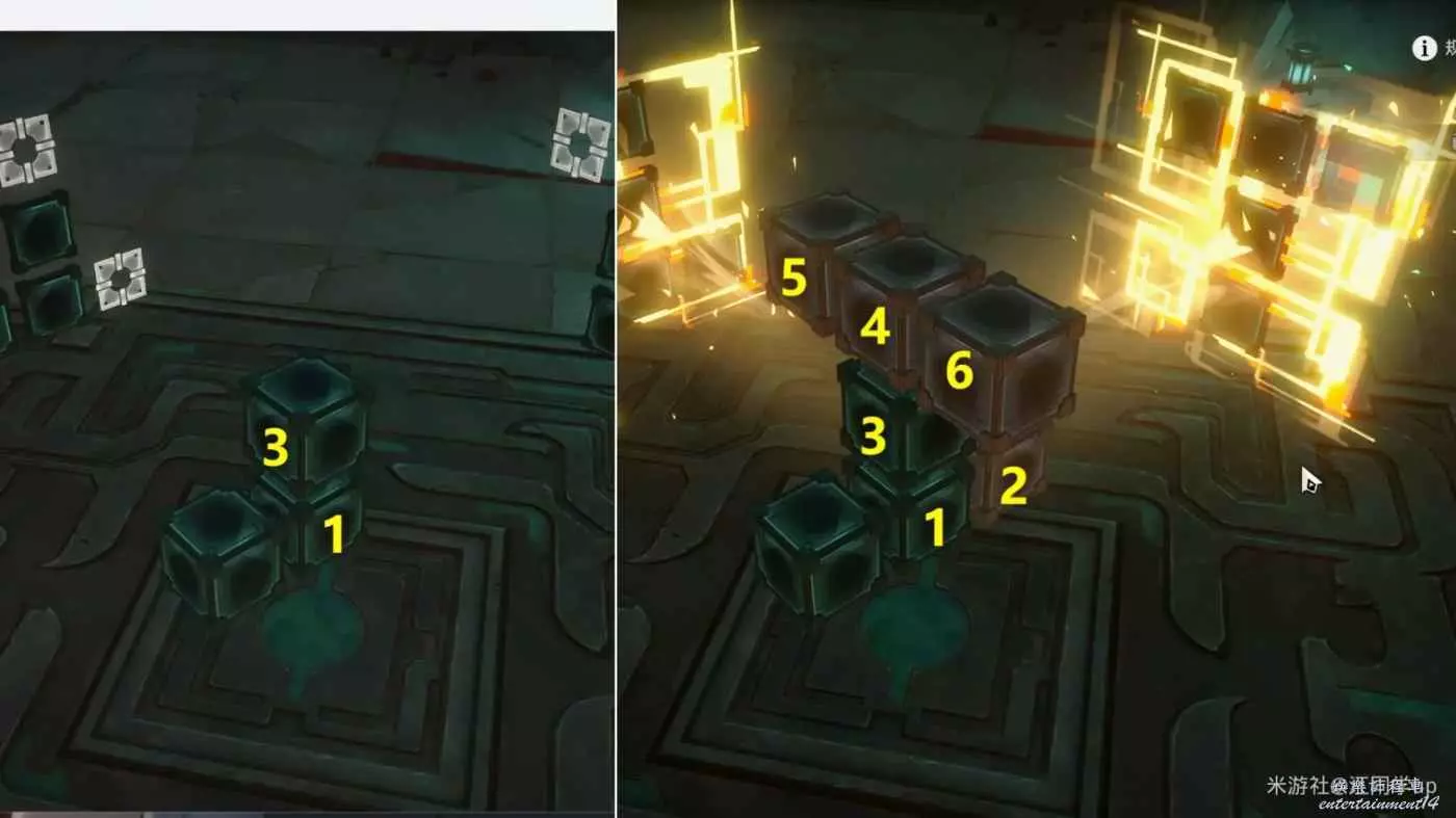 (2)我拿第1個魔方解密給大家說明一下,先點擊1位置方塊後,1位置方塊上面就會出現2方塊虛影,接著點擊2方塊虛影后,就會將2方塊放到了1位置方塊上面了,以此類推,繼續點擊2方塊後出現3方塊虛影,接著點擊3方塊虛影后,就會將3方塊放到了2位置方塊上面了,這時中間裝置造型與兩側薄板裝置對應後,即可完成解密
