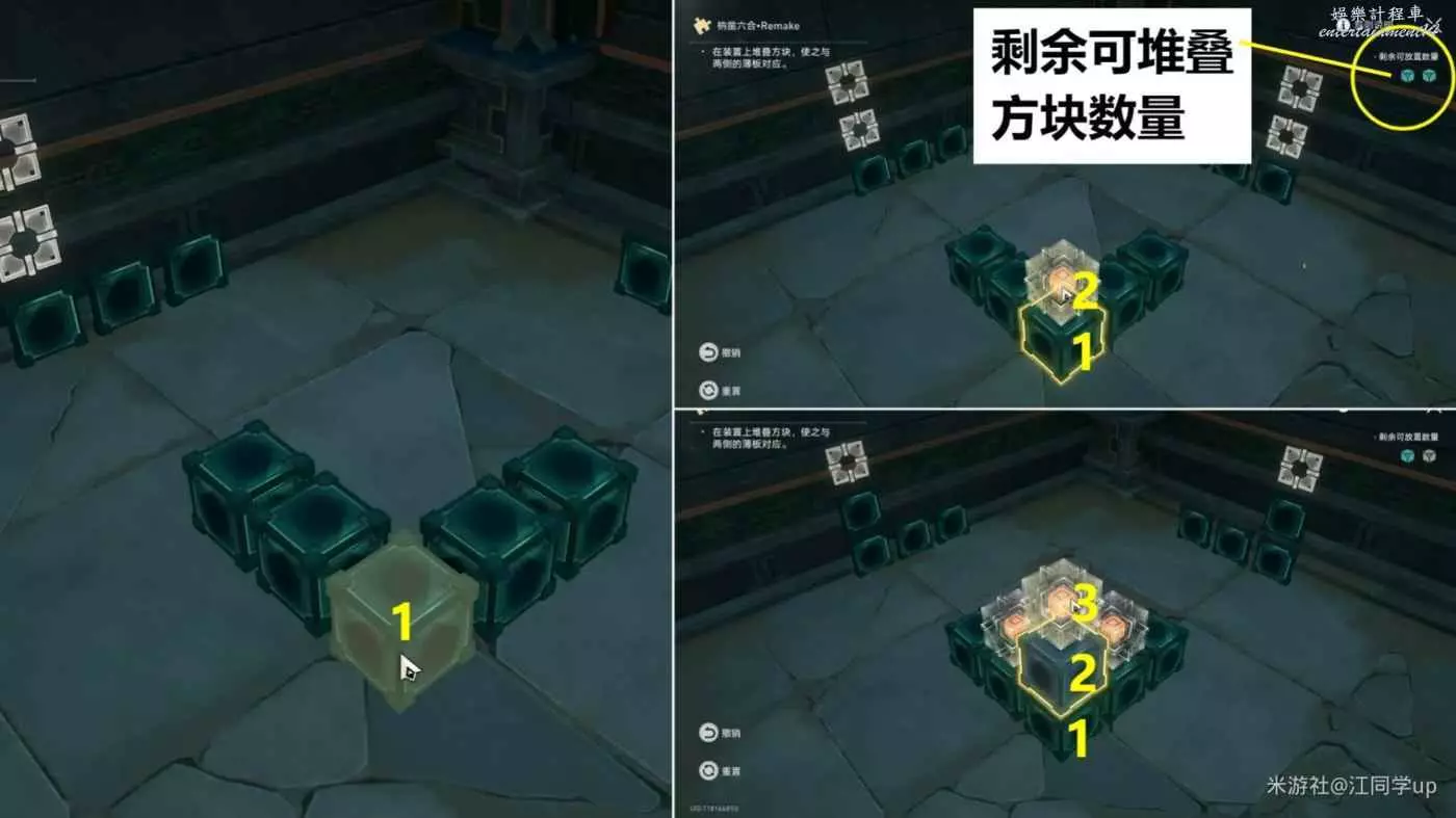 (1)右上角顯示的是可堆疊方塊的數量,接著將這些方塊放到中間裝置造型特定位置方塊上後,使中間裝置造型與兩側薄板裝置對應時,即可完成解密