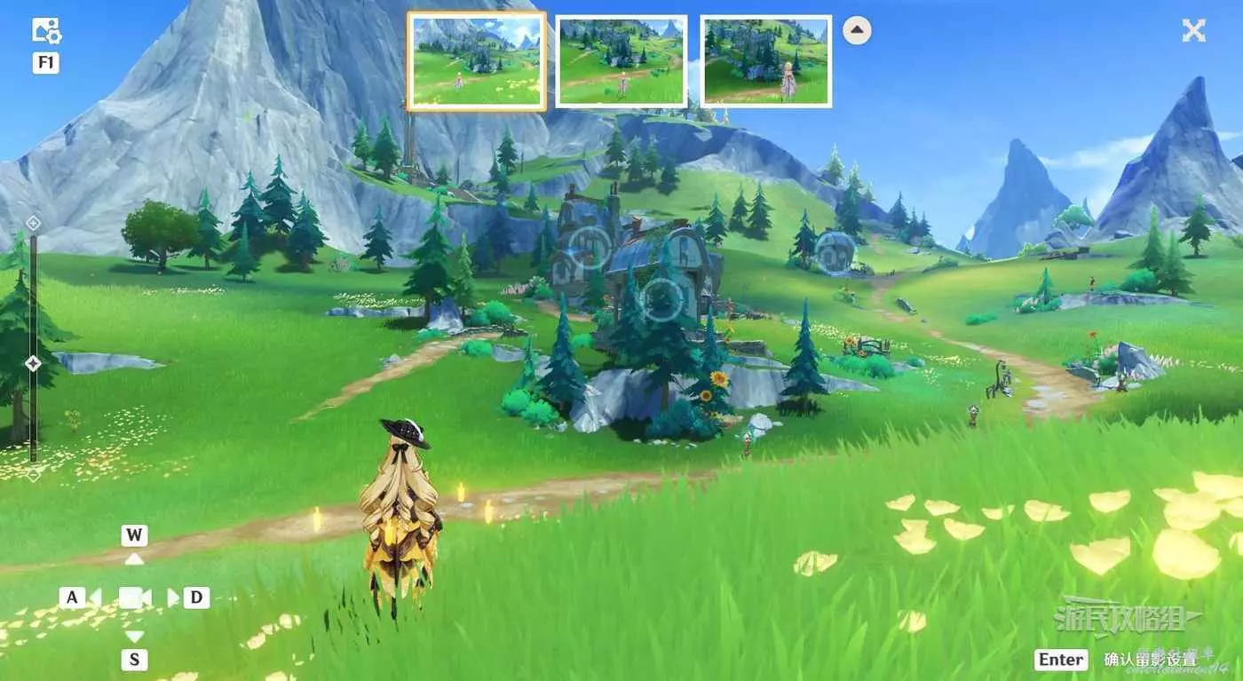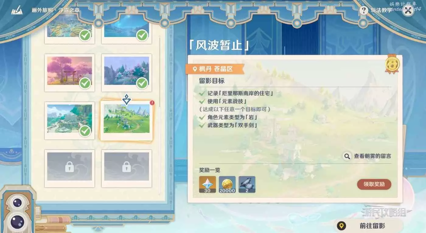 角色選擇諾艾爾/娜維婭等(滿足任意一個條件即可:選擇任意岩元素角色,選擇任意使用雙手劍的角色),將所有圓點保持在鏡頭內,可以直接點擊上方三種角度,然後點擊右下角保存留影設置。