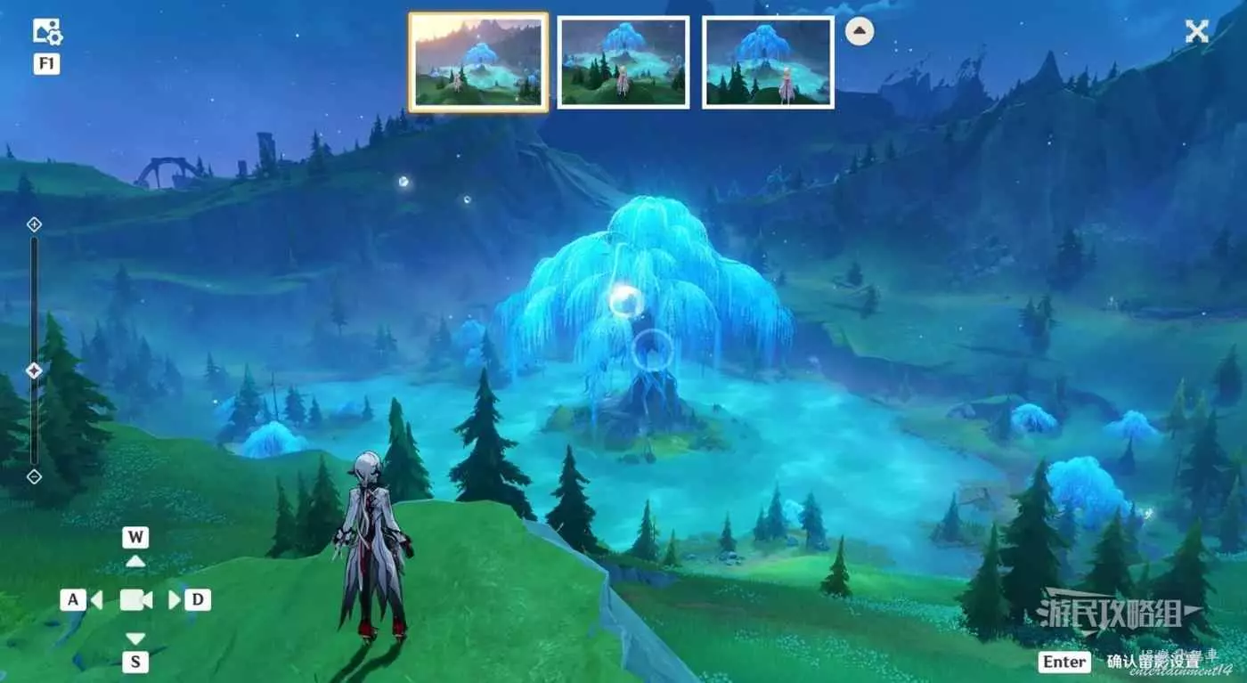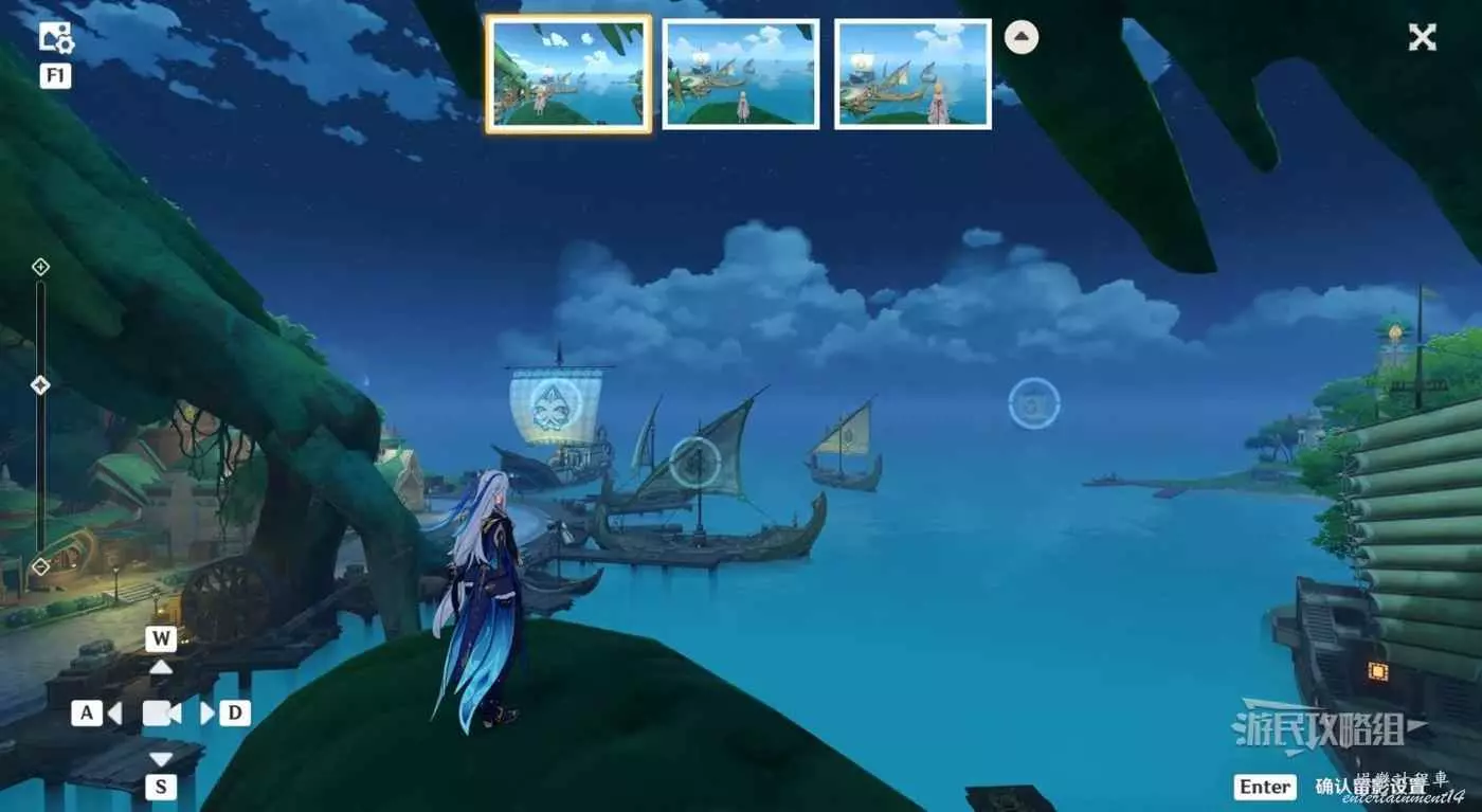 角色選擇芭芭拉/莫娜/珊瑚宮心海/那維萊特等(滿足任意一個條件即可:選擇任意水元素角色,選擇任意使用法器的角色),將所有圓點保持在鏡頭內,可以直接點擊上方三種角度,然後點擊右下角保存留影設置。