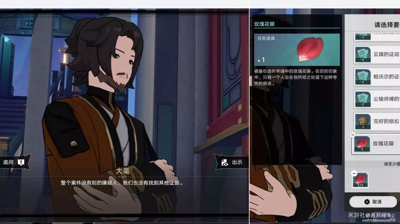 (8)拿到5個證物再次和【大豪】對話後,需要完成一次辯論,開始後點擊右下3次下一句,到【大豪】說【我們也沒有找到其他證據】時,再點擊【出示】,然後提交證物【玫瑰花瓣】後,即可完成辯論