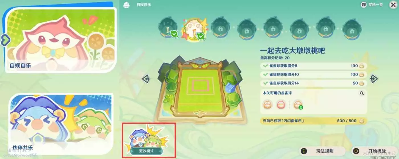 2.活動有兩種模式:「自娛自樂」單人模式和「夥伴共樂」雙人模式,在選擇關卡介面,可以在左下角進行模式更改;兩種模式都能獲得兌換獎勵所需的「閃閃雀雀幣」。不想玩「夥伴共樂」雙人模式的旅行者也不用擔心,完成「自娛自樂」單人模式,每個關卡的所有任務目標也是可以拿滿獎勵的