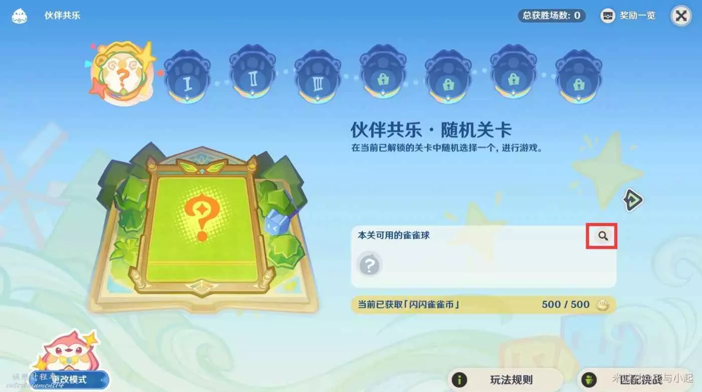 3.「夥伴共樂」雙人模式可以自選關卡,也可以隨機關卡,在關卡選擇介面中間靠右位置有個放大鏡的圖示,可以查看當前關卡可用的雀雀球(「自娛自樂」單人模式也可以在相應的位置查看可用的雀雀球)