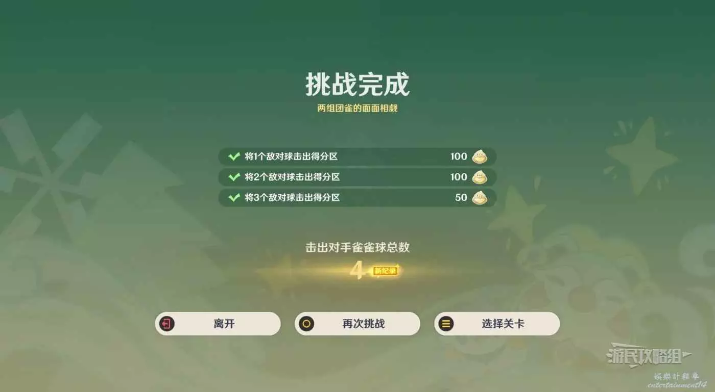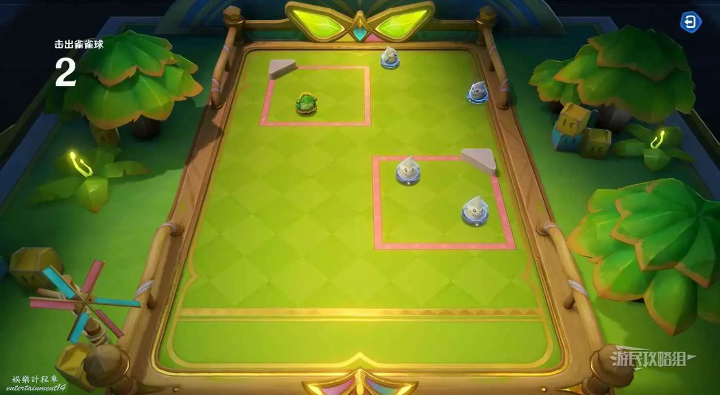 本關有2個得分區,可以利用孤獨雀雀球將其中一個區域內的敵對球擊出得分區,然後用貼貼雀雀球將另一個區域內的一個雀雀球擊出得分區,再用普通球把剩餘一個敵對球擊出即可完成。