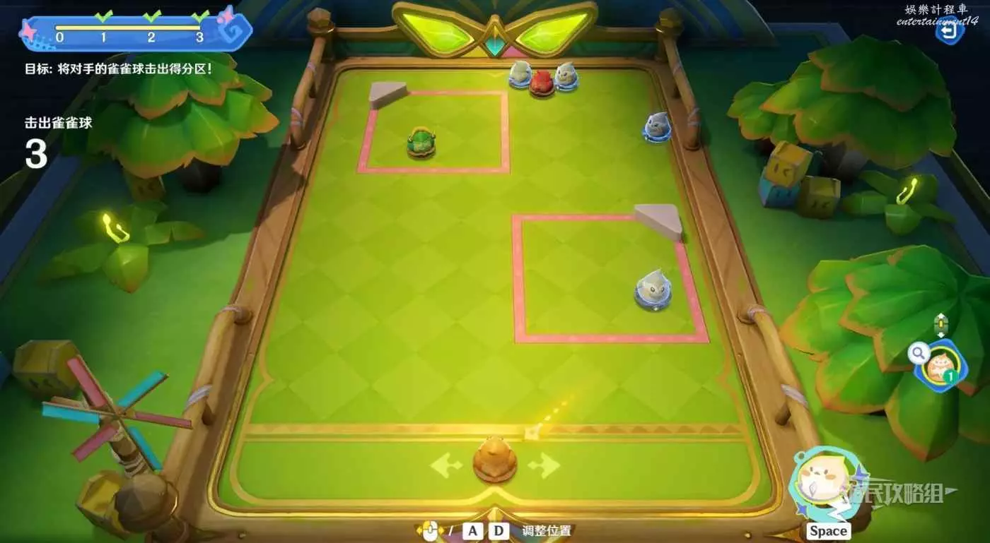 首先使用孤獨雀雀球時,建議選擇遠處的得分區,如果選擇近處得分區,可能會將近處得分區內的敵對球彈到遠處得分區內,比較不好處理。